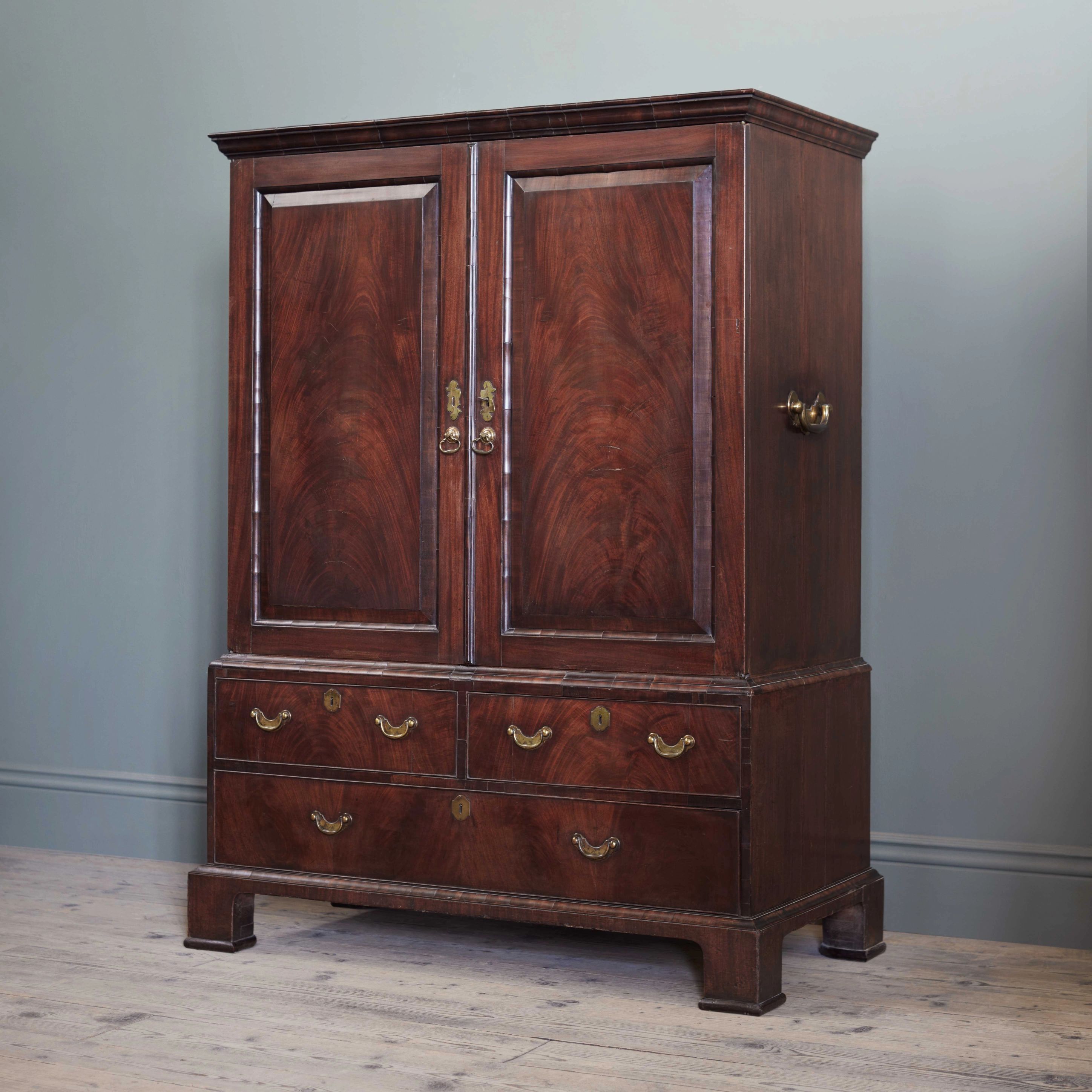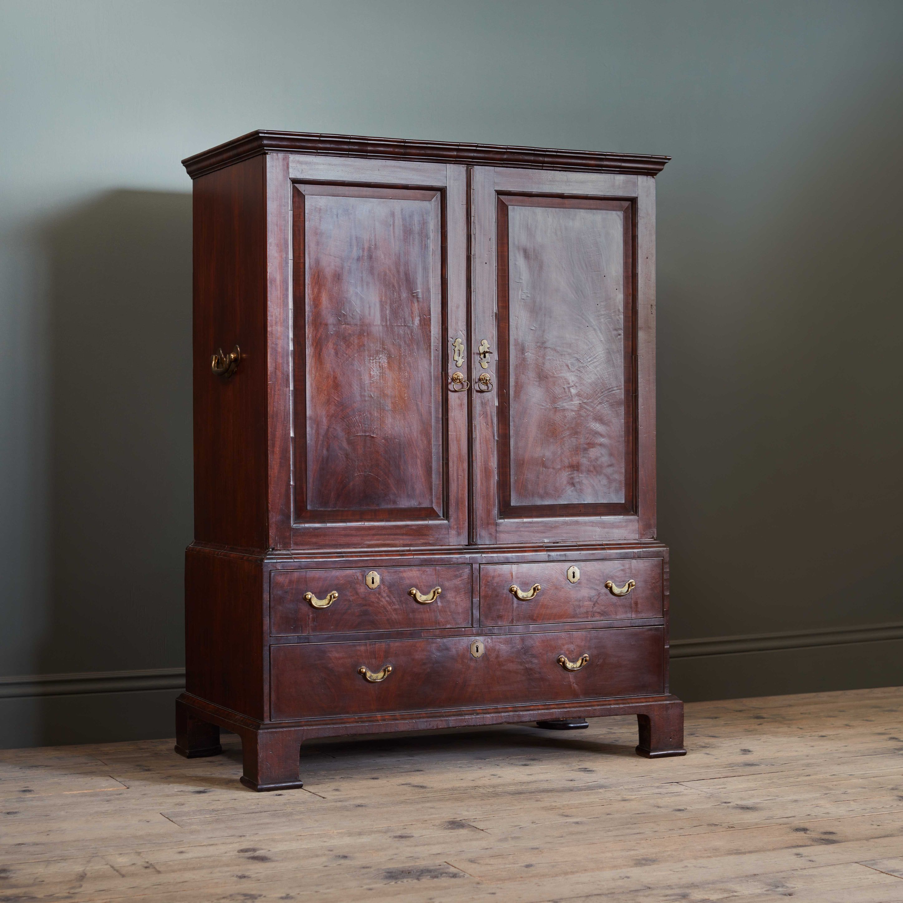 The mahogany surface with a depth of timber patination, and exceptional surface; the panelled doors enclosing sliding drawers which can be extended and rested on the ‘door runners’, above two short and one long drawer. With colossal scale original metalwork, and brass carrying handles to the flanking sides.