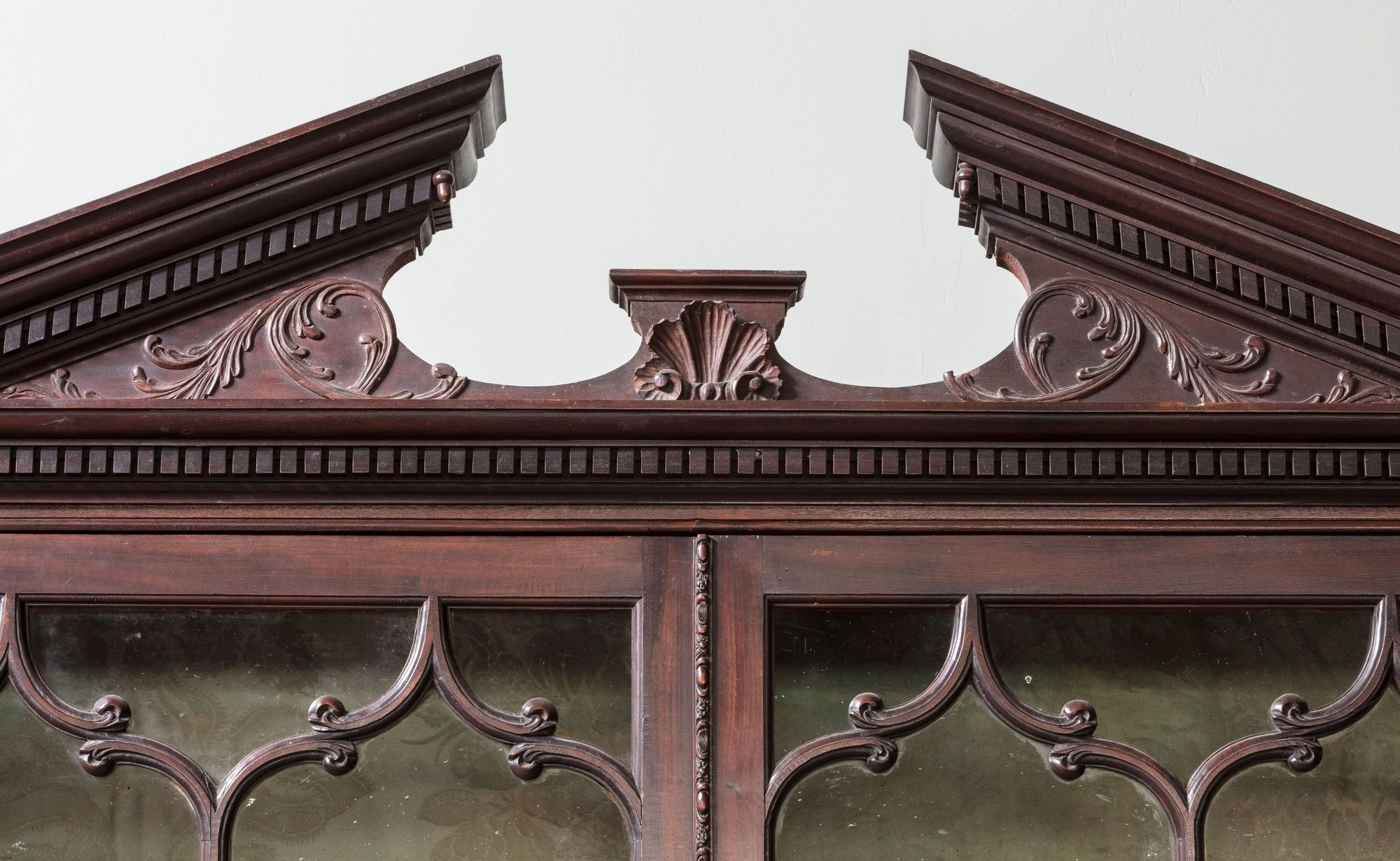 With broken pediment, decorated with dentil foliate and shell motif.