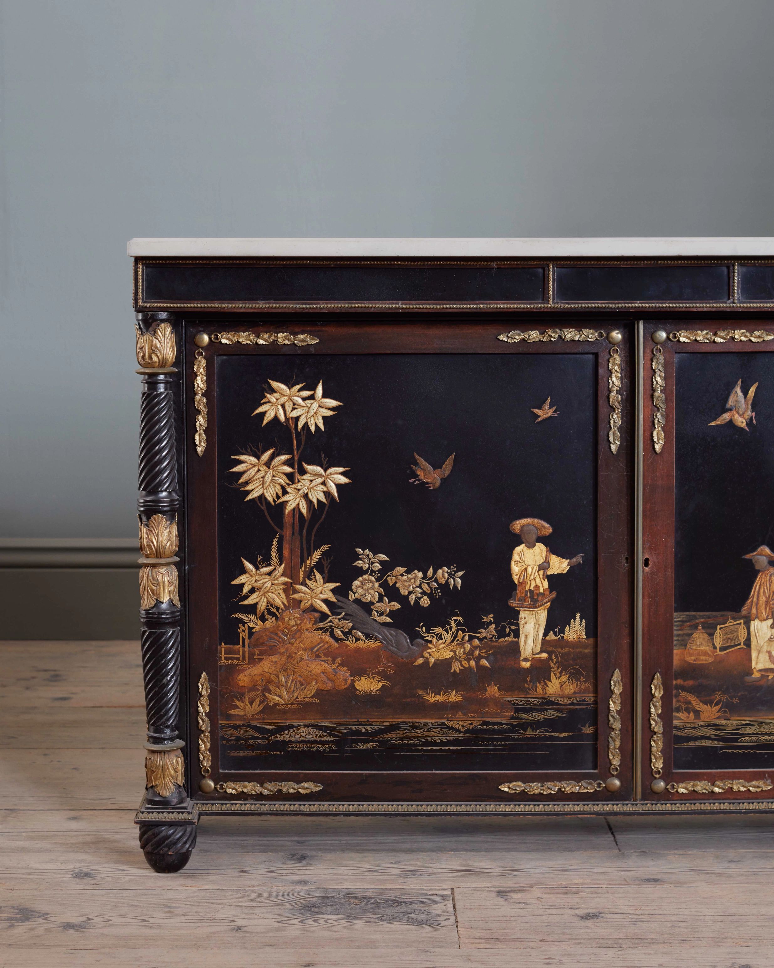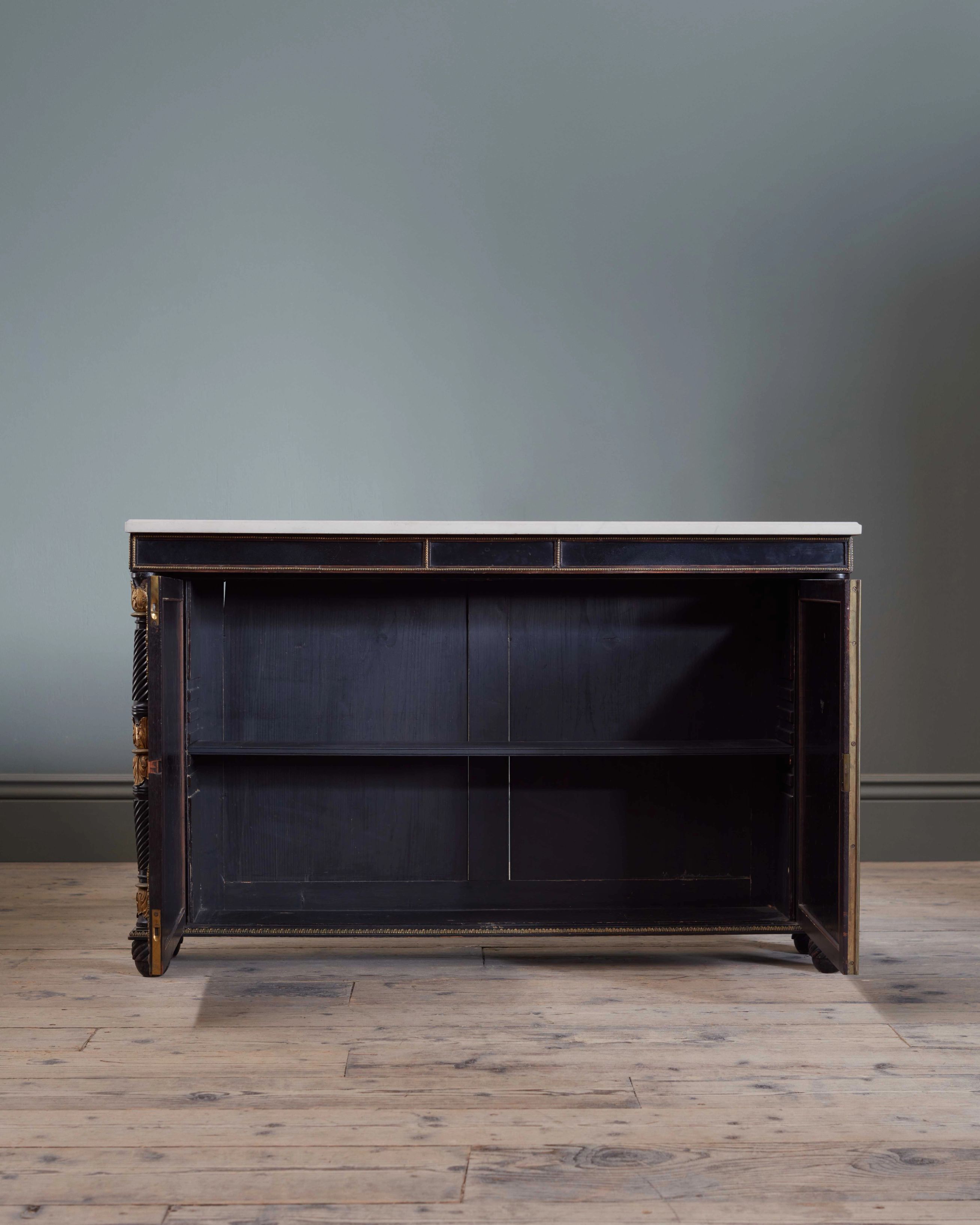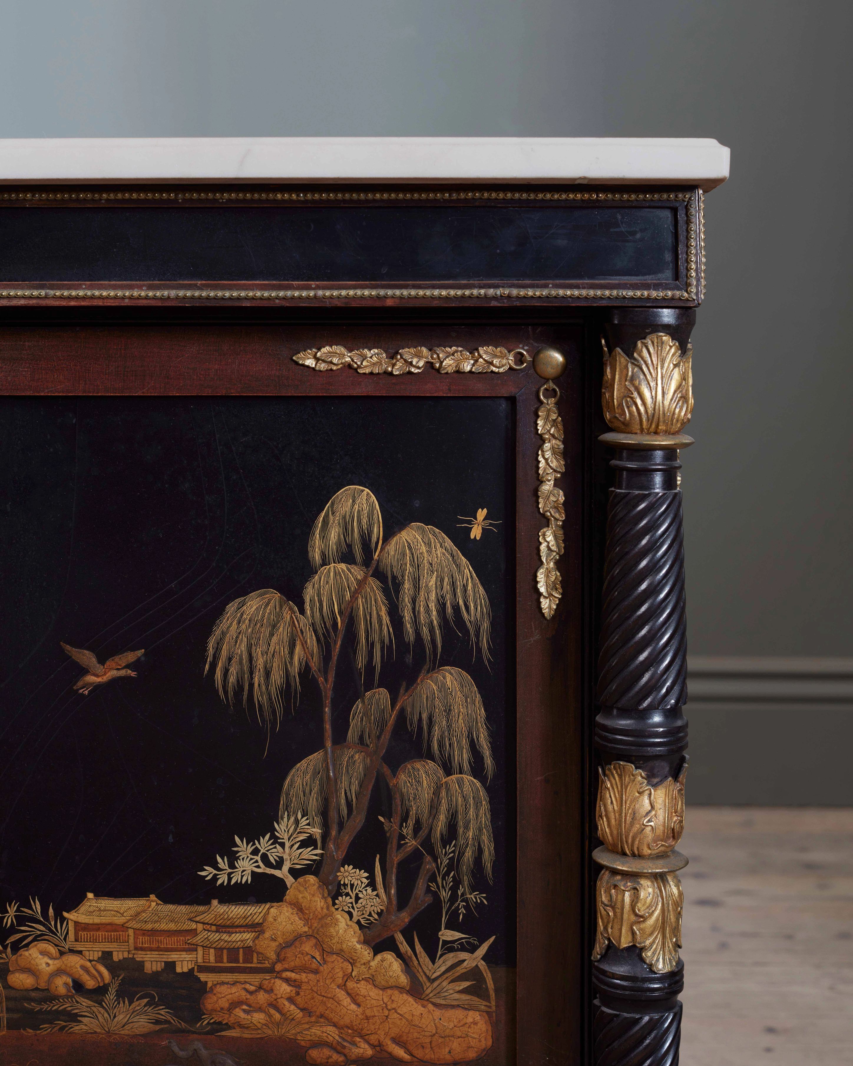 With white marble top and ormolu mounts, above two papier maché doors decorated with simulated Japanese lacquer panels, enclosing an adjustable shelf, flanked by spiral & reeded columns and bun feet, stamped ‘CLAY LONDON’ to the reverse of each door (Henry Clay, c.1825)
