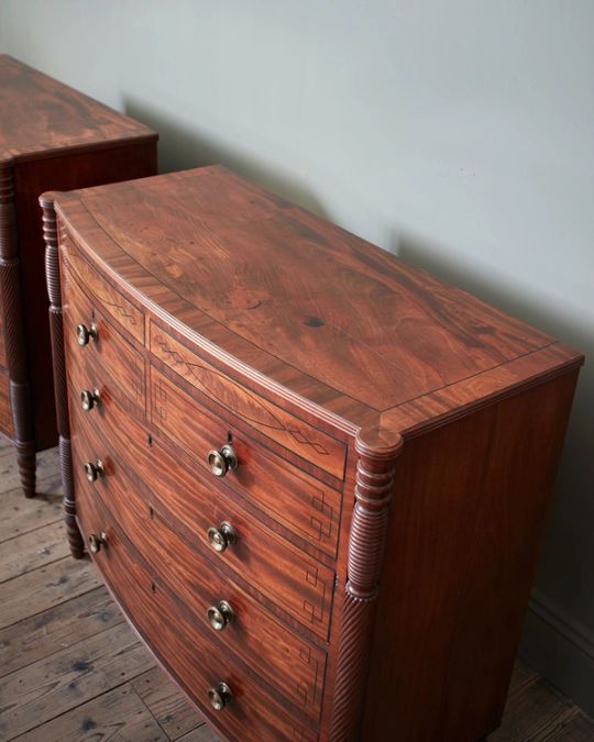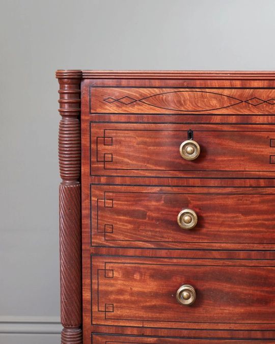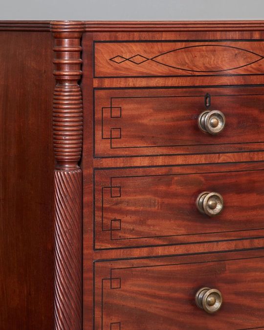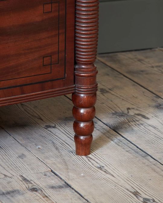 Of strong proportions, with bow fronts and two short and three graduating drawers, with beautifully turned pilaster ends, and sparse, graphically designed ebony inlay, with brass handles.