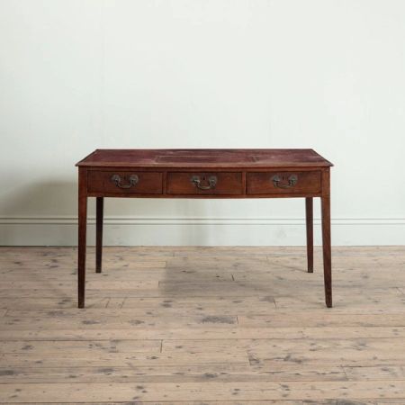 With adjustable ratcheting writing slope, three front drawers and brass handles, on straight mahogany legs.