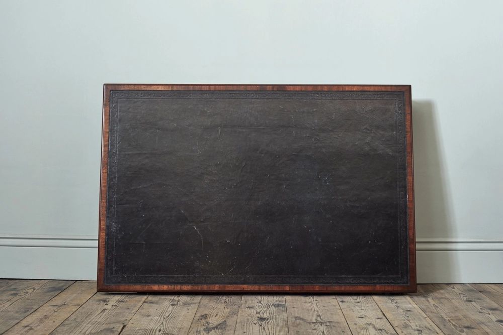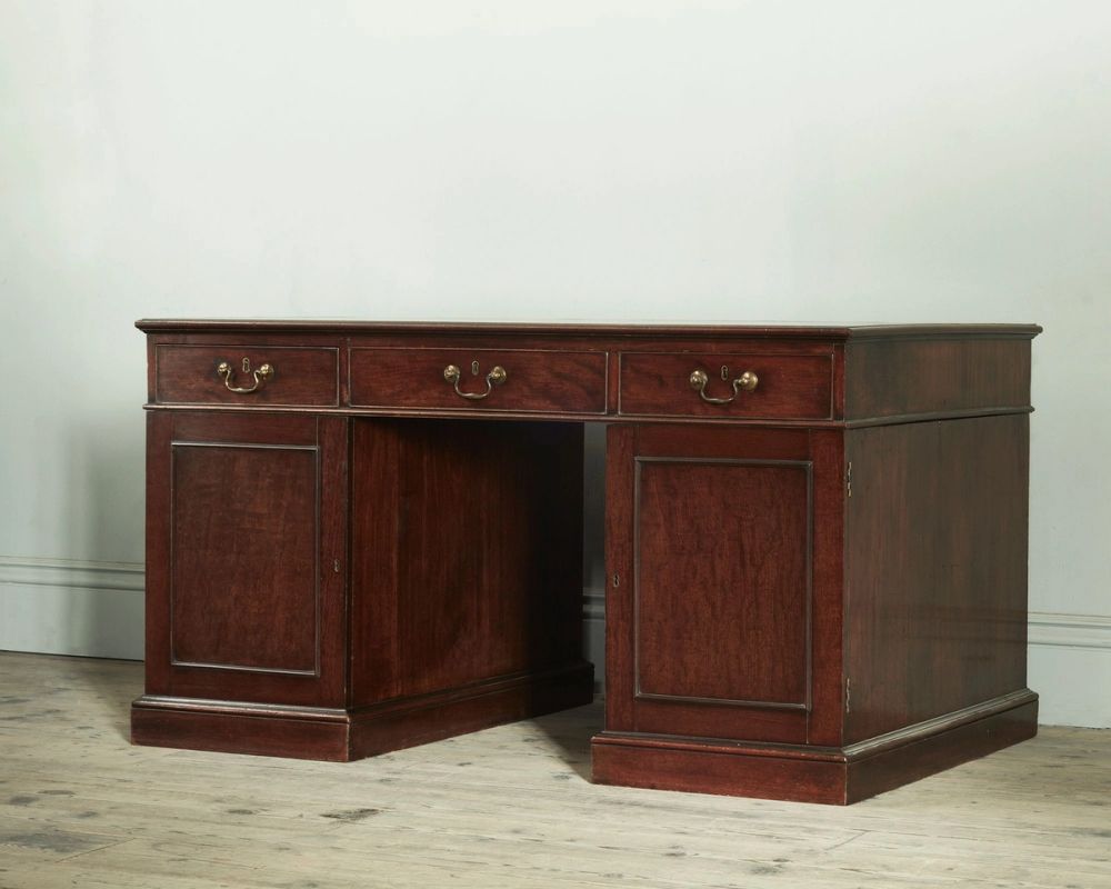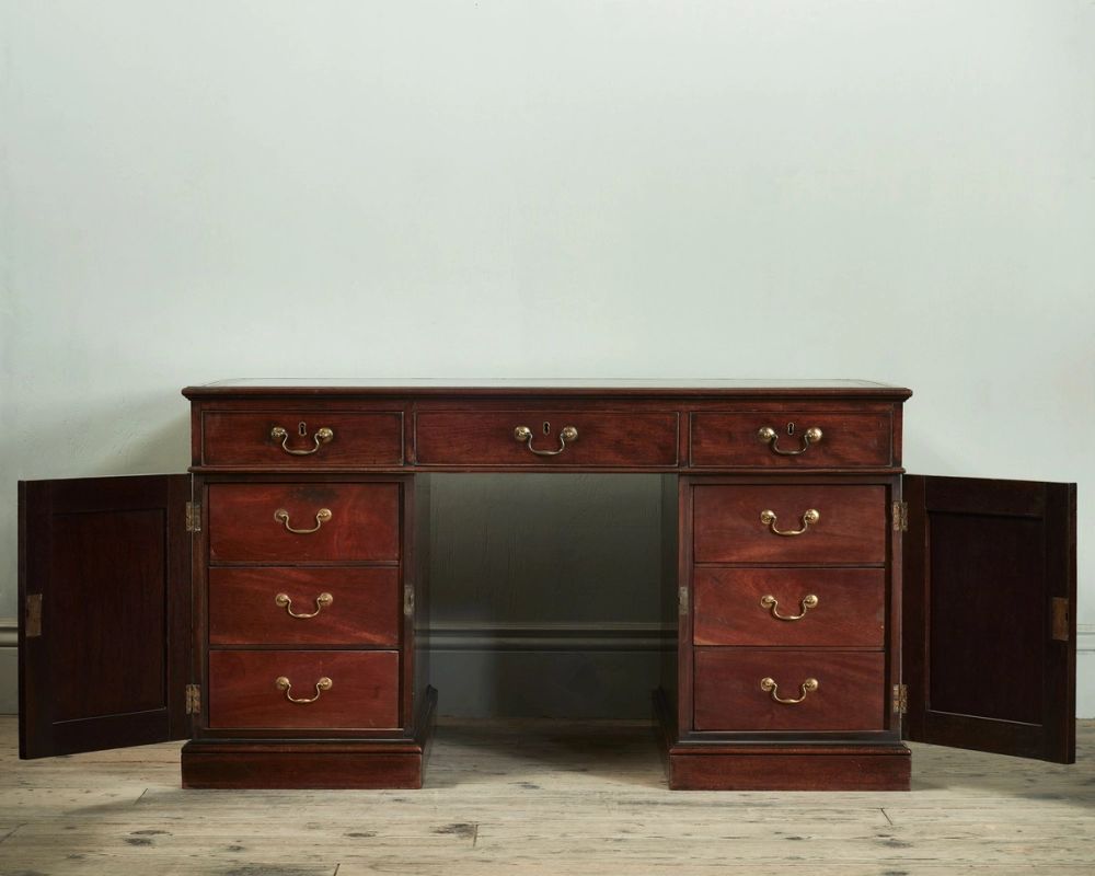 With three drawers to each side, one side with three graduated drawers to each pedestal, the opposing side with two cupboard doors enclosing three graduated drawers, and beautifully inset black morocco leather top.