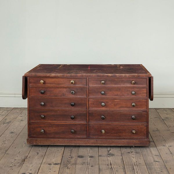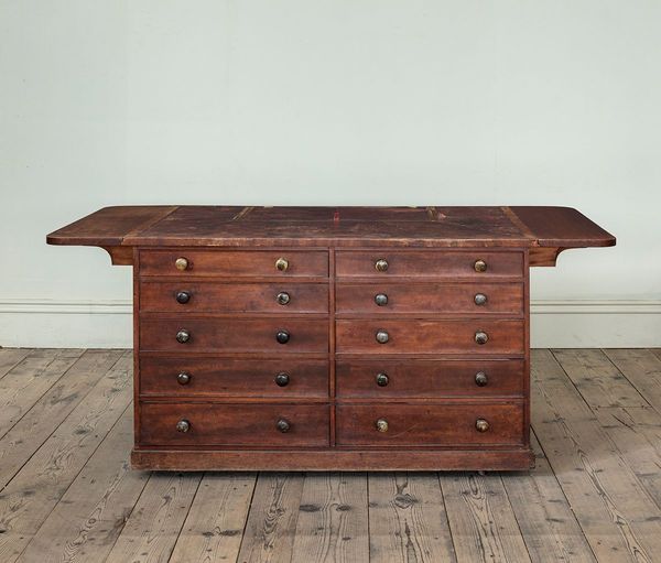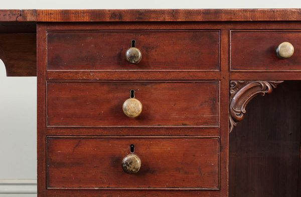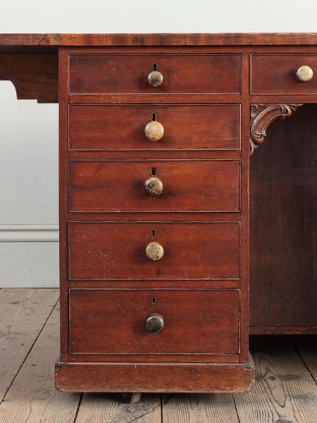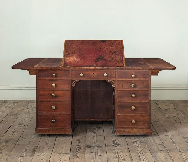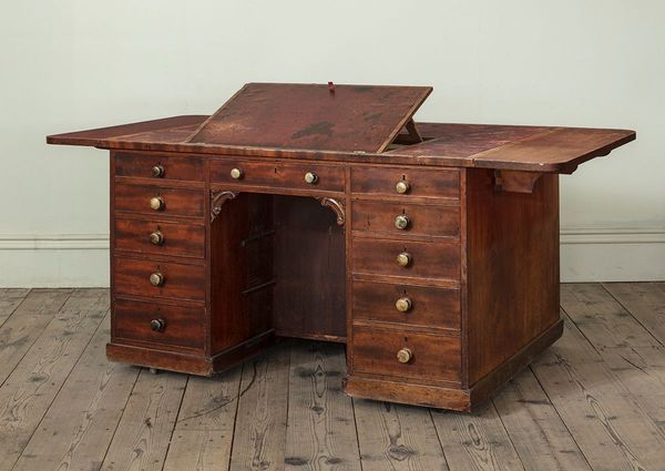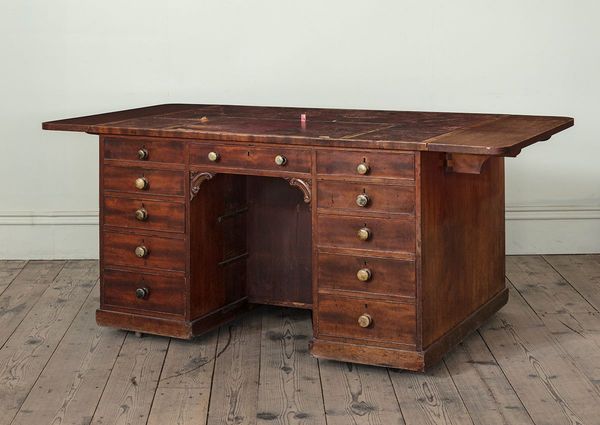 With two flanking pembroke leaves and leather tooled top with writing stand, above ten long drawers on pediment base, with spandrel carved knee hole section, resting on inset casters.