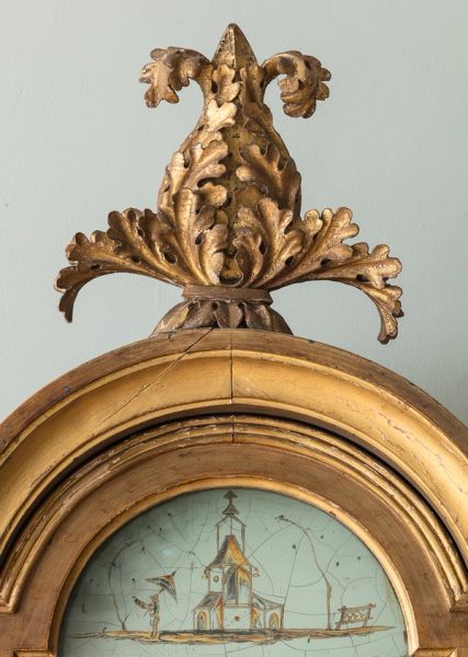 The clock face, containing hour and minute hands, with separate seconds dial and date wheel, in white and duck egg enamel, decorated with pagodas and other chinoiserie motifs, and displaying spidery craquelure throughout.