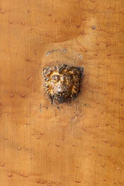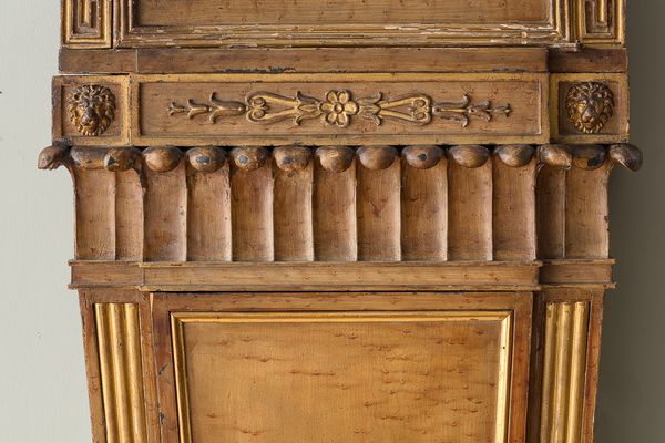 Of highly refined form, with rare and unusual simulated maple decoration on the case, decorated and surmounted with gilded acanthus ornamentation and central gilt bronze lions-head, which lifts to reveal lock and for door panel.