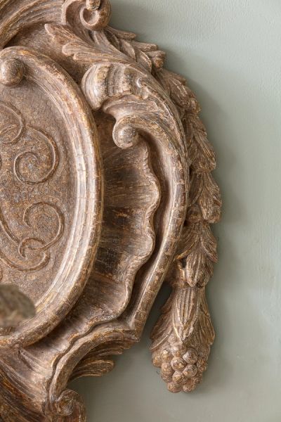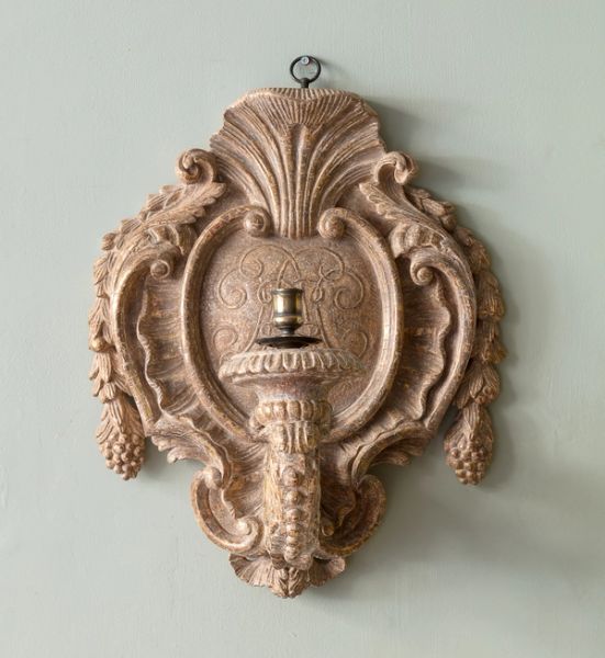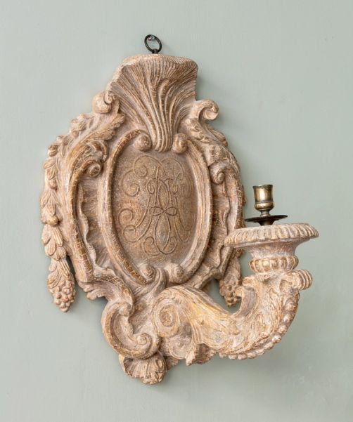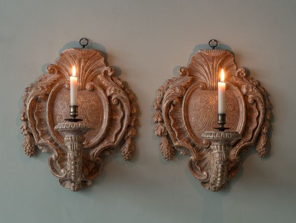 Of bold and architectural design, these finely carved sconces retain much of their original gilding, framed by acanthus sprays, fruiting swags, and surmounted by a shell cresting. The scrolling arms and classical ornament are characteristic of Kent’s grand Palladian interiors, reflecting his influence on mid-Georgian decorative taste, where furniture and fittings became synonymous with architectural design. Fitted with brass rings for wall-hanging.
