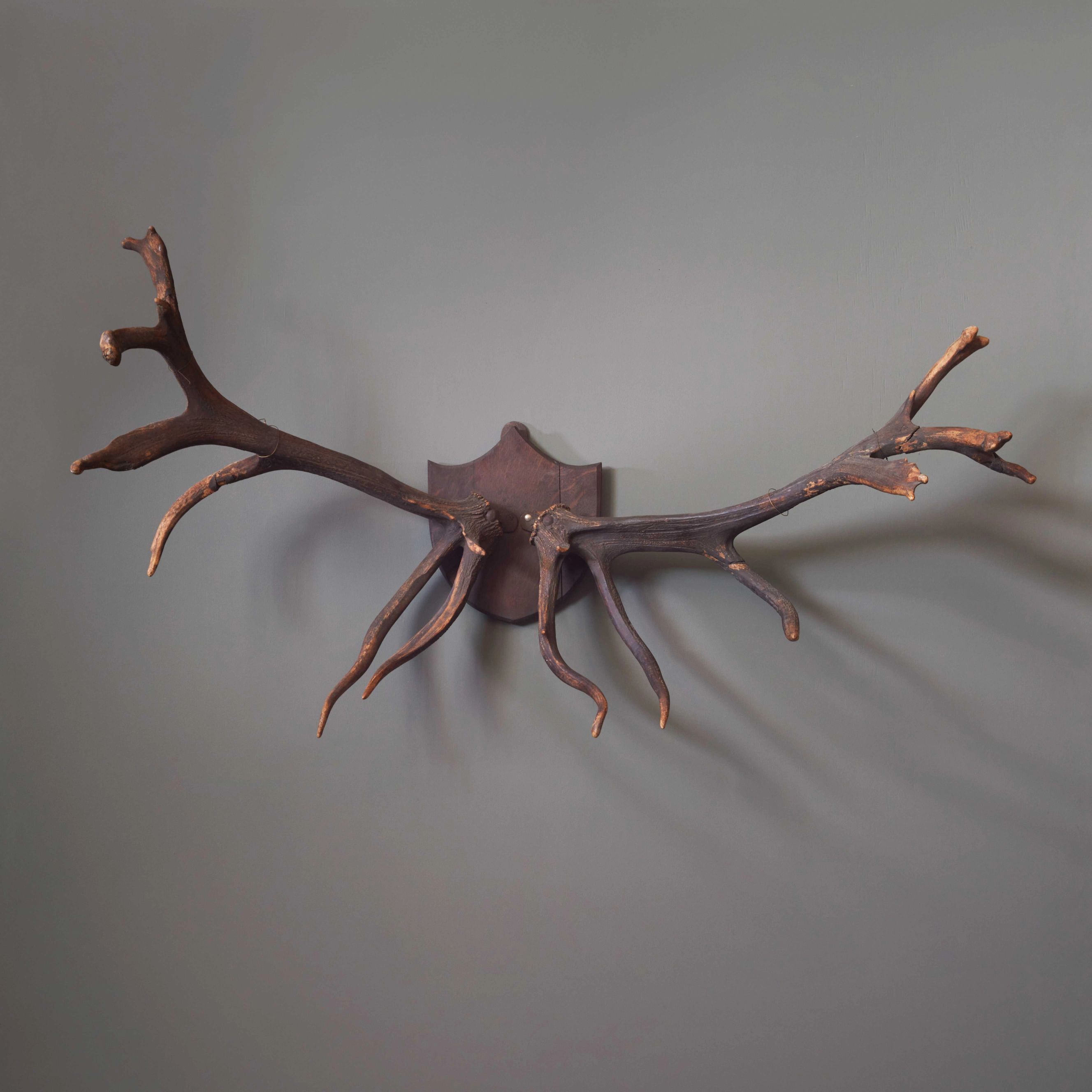 Mounted on a shaped oak shield, the sprawling tines in beautifully untouched condition.