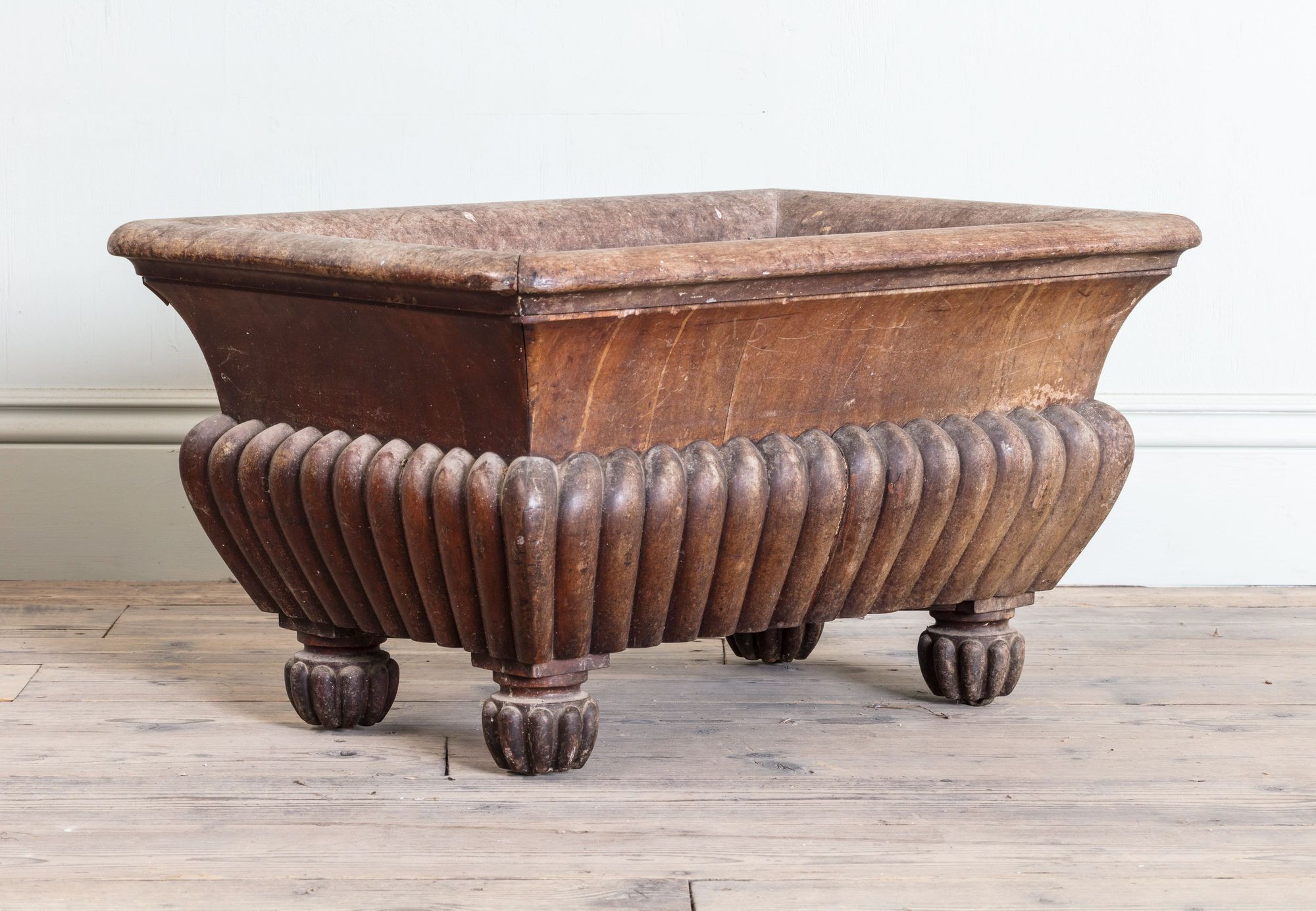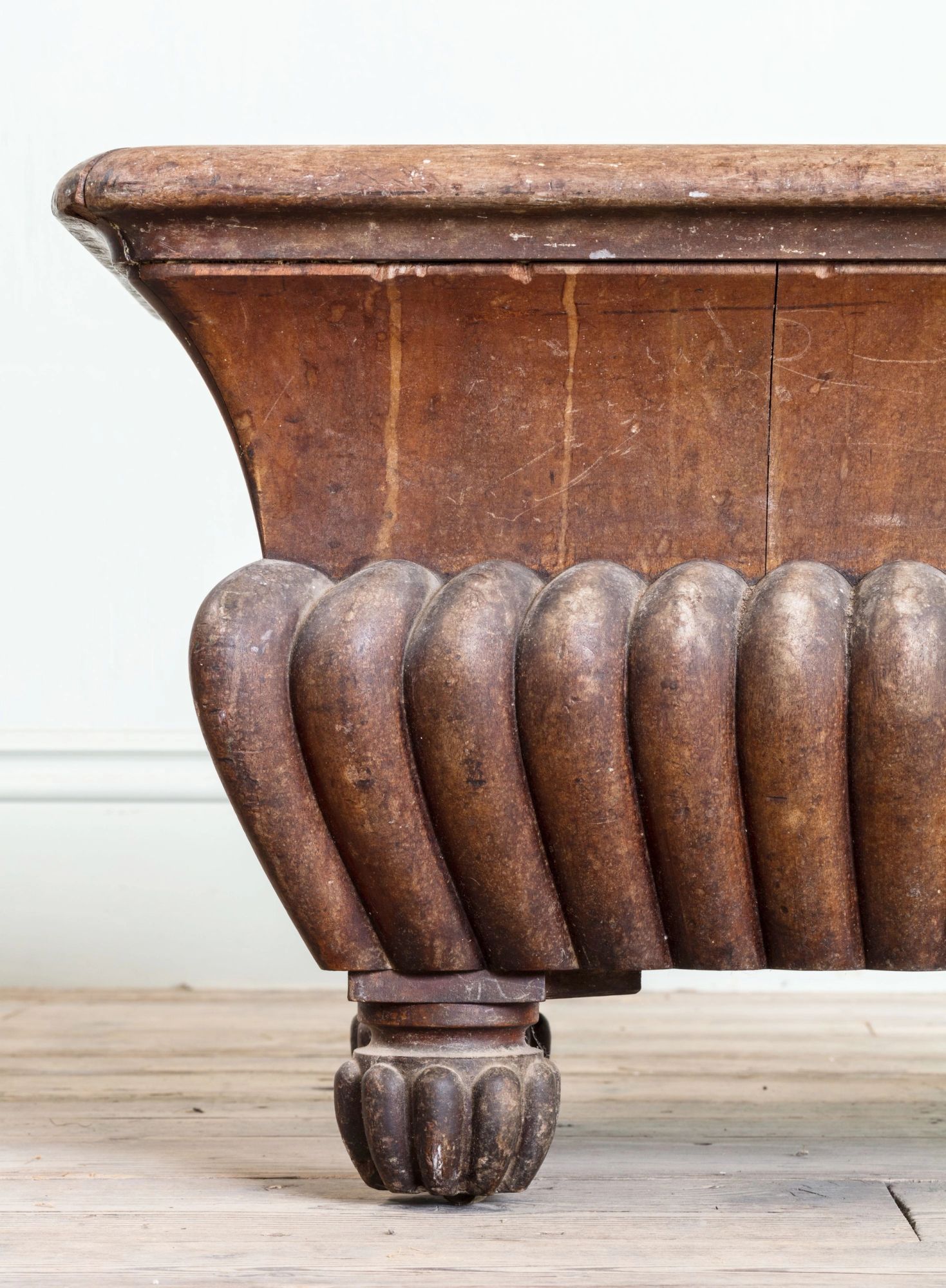 In the manner of Gillows, with protruding reeded detailing on reeded bun feet and inset casters, with exceptional untouched surface, and remains of the original lead lining.