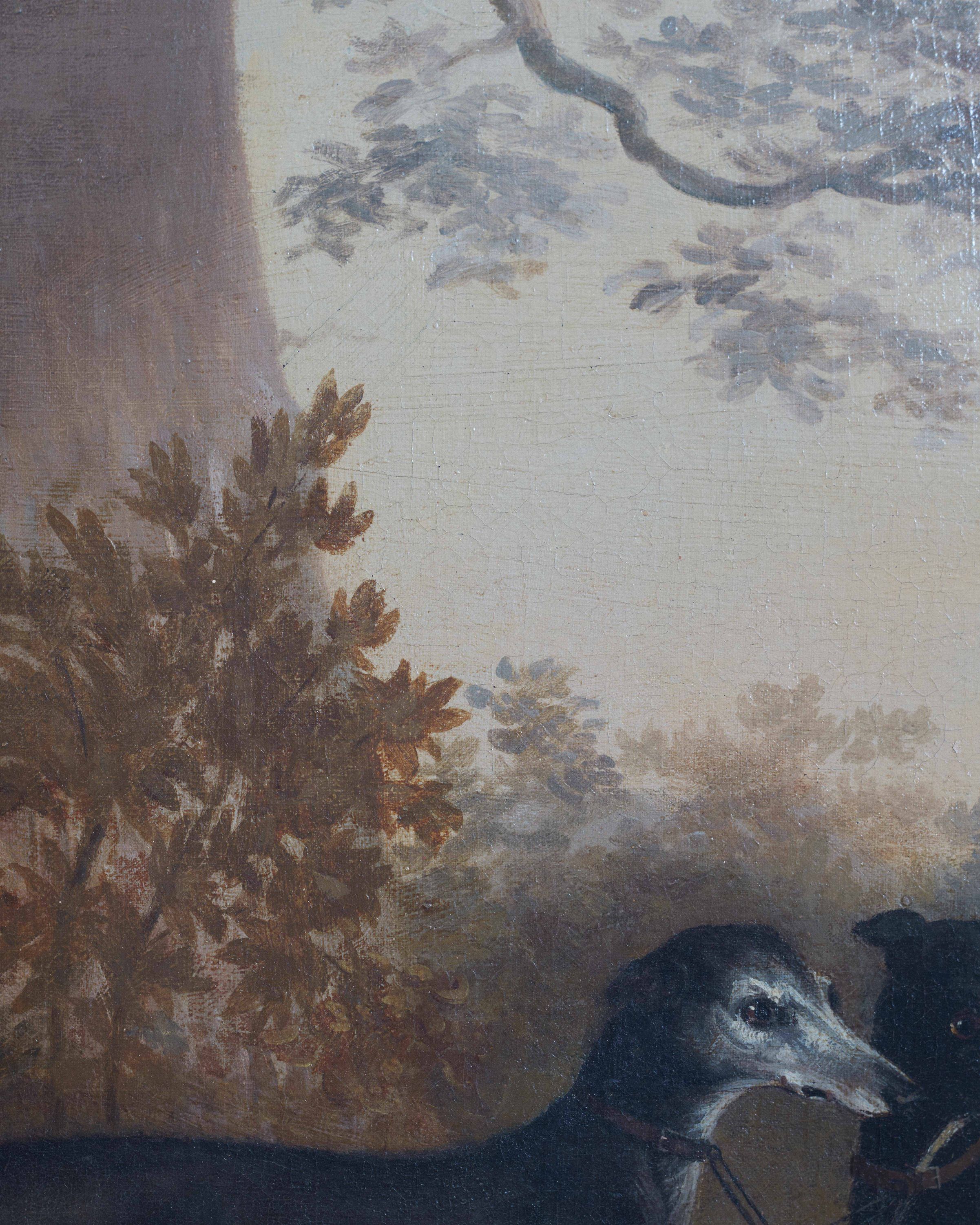 The ink-black coats of the two hunting dogs standing in pleasing contrast to the foliate, autumnal setting, painted in ochres and umbers, with a pale blue sky behind, in a muted tone overall. Evocative of a long day’s sport coming to a close.