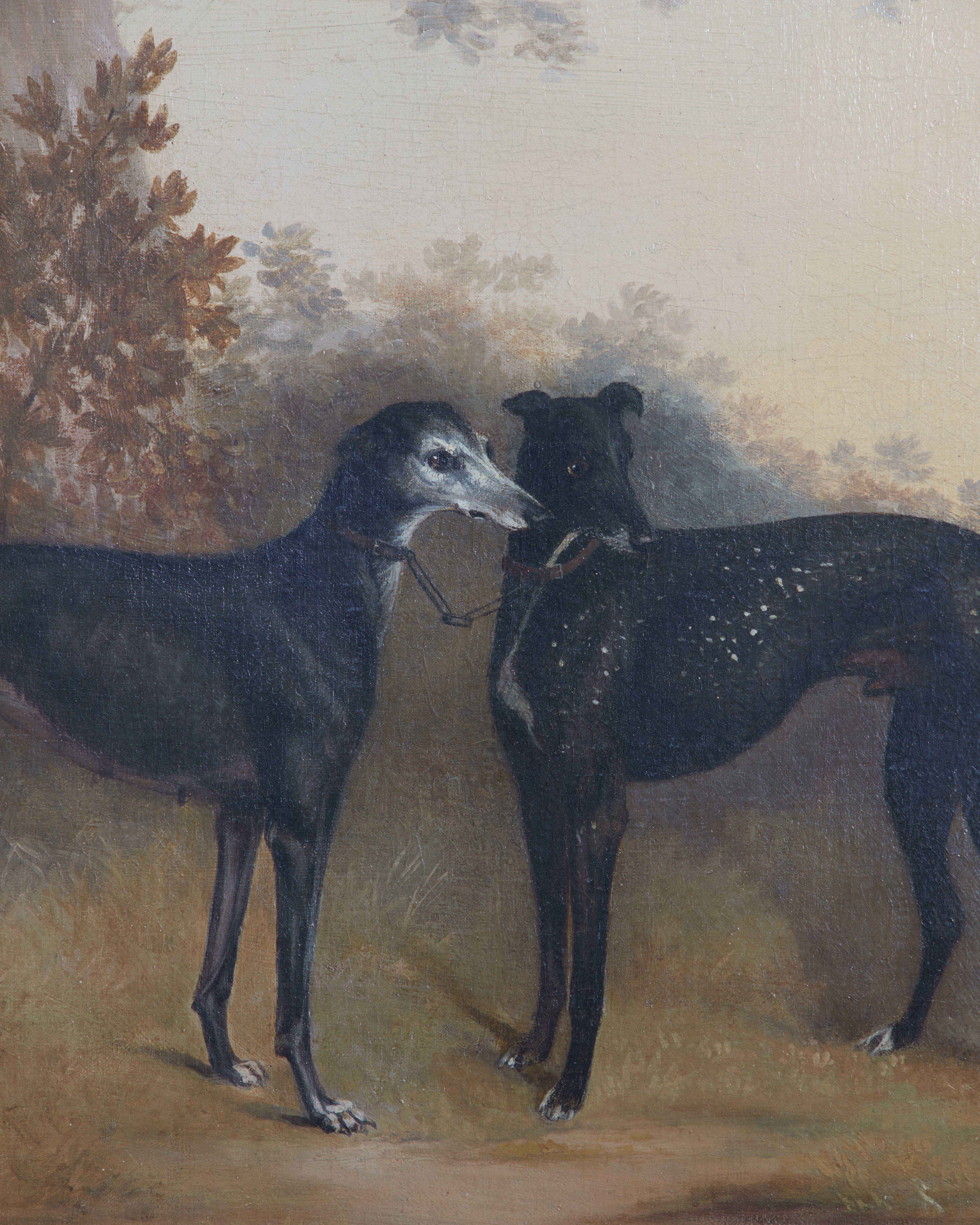 A 19th Century British School Oil on Canvas, depicting a Pair of Greyhounds joined by a Chain