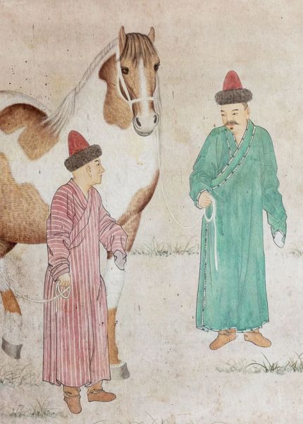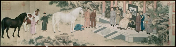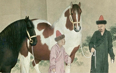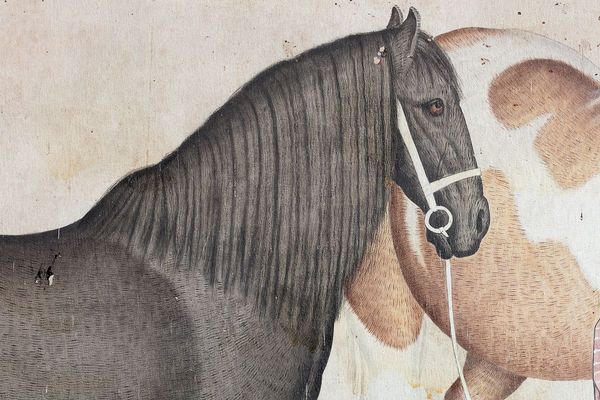 Following the larger painting known by the title, “Kazaks presenting horses in tribute”, by Giuseppe Castiglione (Lang Shi’ning). This subtly executed copy of this original 18th Century artwork (1757, last photographs included), is a beautiful rendition of the Kazak people leading their horses in tribute to the seated Chinese Emperor (the original ink and paper on hanging scroll, is currently housed Ink at Réunion des Musées Nationaux). Painted onto canvas, with two decorative top hanging fixings.