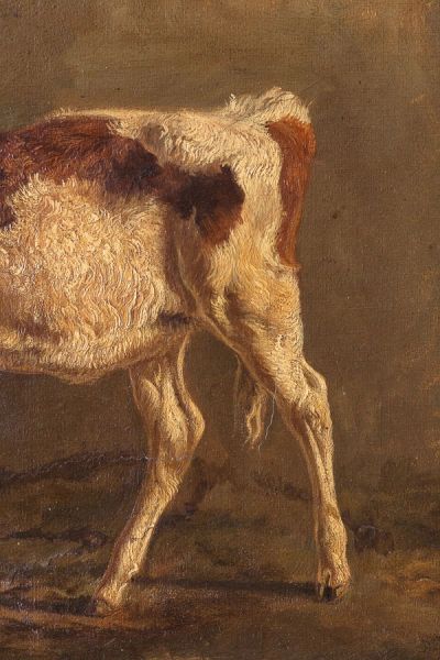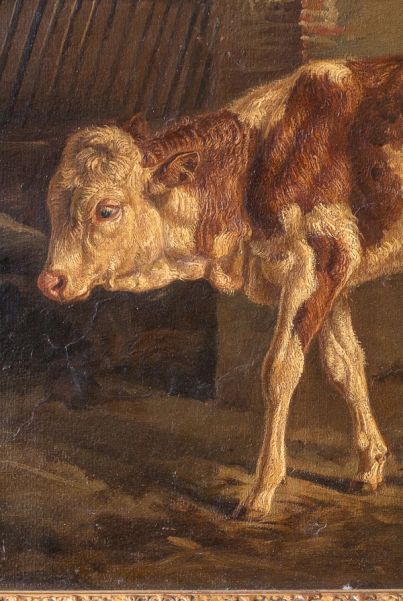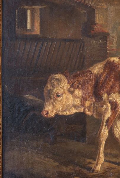 A 19th Century Oil on Paper on Wooden Panel, Painting of a Calf in a Barn
