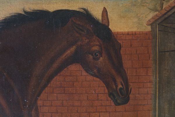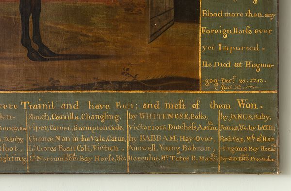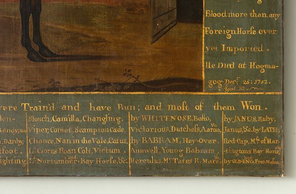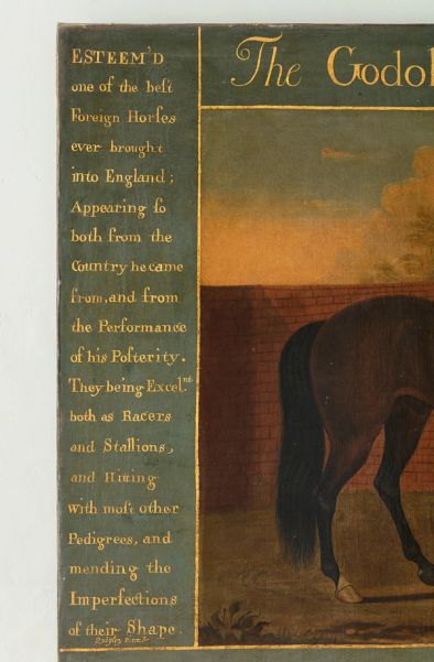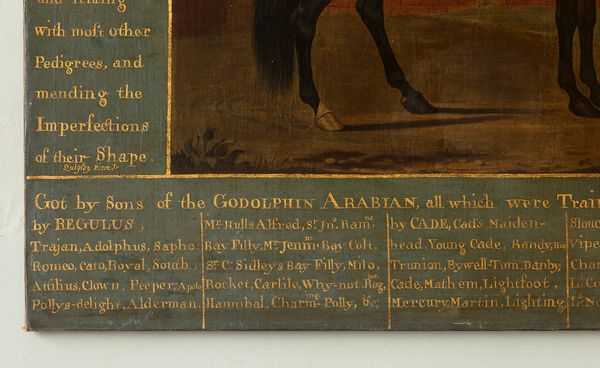 One of four known depictions of the Godolphin Arabian by the Irish painter Daniel Quigley (Active 1750-1778), this exceptional oil on canvas shows the champion sire of 1738, 1745 and 1747, a key contributor to the bloodline of the English Thoroughbred, in profile, head turned slightly to dexter and looking at the viewer, in the yard at Wandlebury, where he died in 1753. The border recounts, in wonderful gilt lettering, the offspring of the Godolphin Arabian, and, in the lower left hand side, the artist’s mark, ‘Quigley Pinxit’, or ‘Quigley Painted [Me]’. Several renderings of this renowned horse exist, including the only known painting from life, by David Morier, in Houghton Hall, and works after this original by Stubbs, printmaker John Faber, and Quigley.