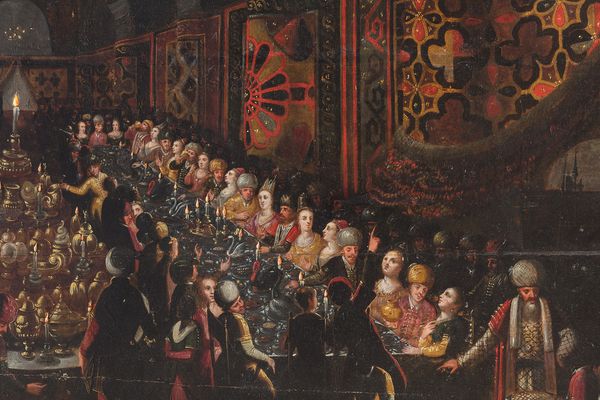 A substantial depiction of the Feast of Belshazzar, taken from the Book of Daniel, at which the 'writing on the wall' declaimed the downfall of King Belshazzar and his dynasty.