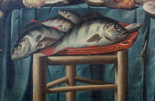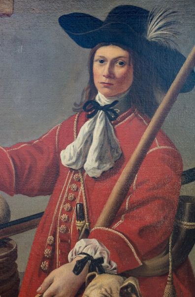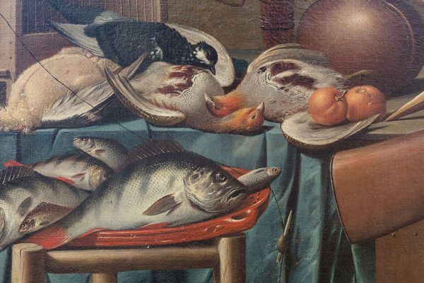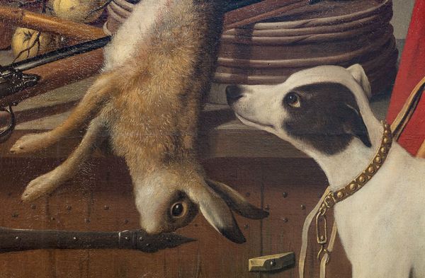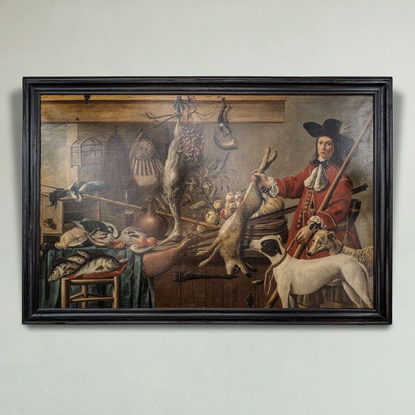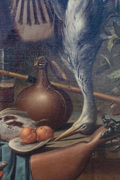 Similarly to his uncle, Steenwijck is chiefly remembered today as a painter of “Vanitas”, his most famous contribution to this genre being a panel now in London’s National Gallery (fig. 1). However, like many still-life artists from the period, Steenwijck also produced interior scenes, ranging from representations of rustic environments such as taverns and country kitchens (Peasant in a kitchen interior with still-life, Musée des Beaux-Arts, Caen) to depictions of more refined spaces, as exemplified by the present canvas. Motifs of game, fish, jugs and fruit are characteristic of his repertoire (Still life with an earthenware jug, fish and fruit, Rijksmuseum, Amsterdam; Still life with fruit and plucked duck, Städel Museum, Frankfurt) and are displayed here within the framework of the return from the hunt. On the right, a gentleman in a crimson red robe with golden buttons holds a dead hare, his two hounds standing obediently by his side and his shooting rifle resting on the countertop in the centre. The dogs are described with particular attention to their appearance and fur, which indicates they were painted from life. A large horn is fastened across the young man’s torso, while two smaller powder-horns hang from a wooden ledge above. The lifeless heron next to them, paired with grapes, may hold symbolic significance connected to the Eucharist, while the other items hanging from hooks can be identified as hunting paraphernalia (a powder-bag, nets, and bird cages). Such incorporation of symbolism within a seemingly mundane subject is not usual in art of the Dutch Golden Age, especially within the context of still-life painting, which – as in the above-mentioned case of the “Vanitas” – often presented more than one layer of meaning.