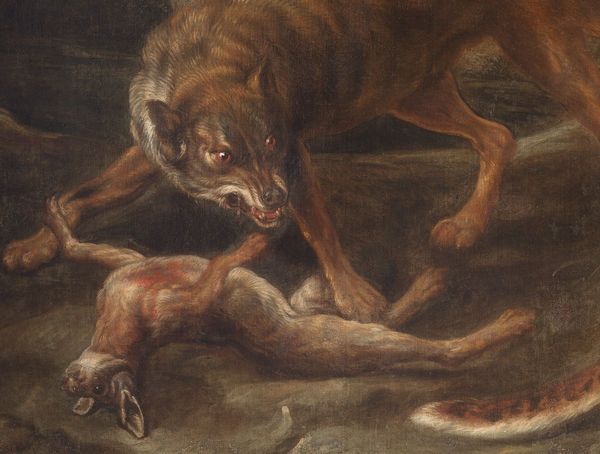 A mid 17th century large scale oil on canvas depicting a Leopardess, a Lioness and a Wolf toying with a Dead Hare in an Arcadian landscape; in the style of the Dutch Golden Age ‘Animaliers’ and the circle of Frans Snijders.