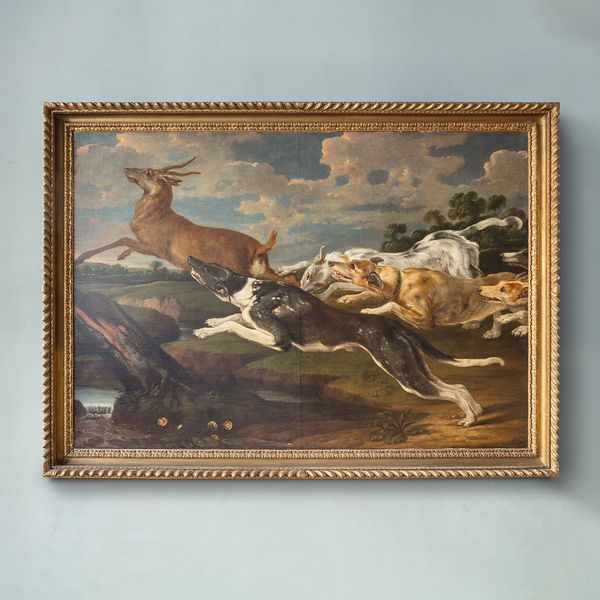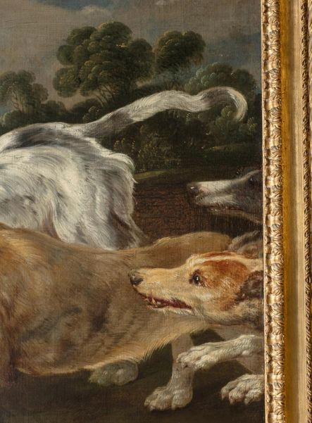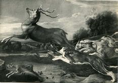 Celebrated by contemporaries at home and abroad, Snyders continued to paint into his old age, and like many established artists ran a thriving workshop that often replicated the master's compositions, sometimes with variations based on different designs and models available in the studio. In the case of the present painting, the subject is drawn from a hunting scene by Snyders now in the Pinacoteca di Brera in Milan, dated to about 1621 (fig. 1). The stag chased by hounds enjoyed particular popularity as a theme - no doubt owing to its characterisation as an aristocratic pursuit - and is brought to life with brilliant force here by the artist's confident brushwork and palette.