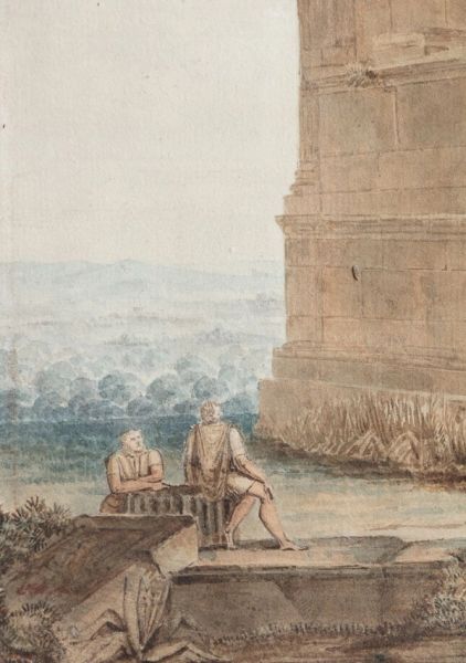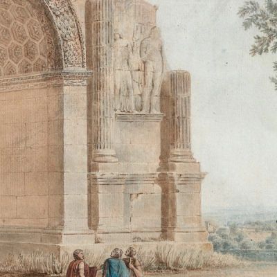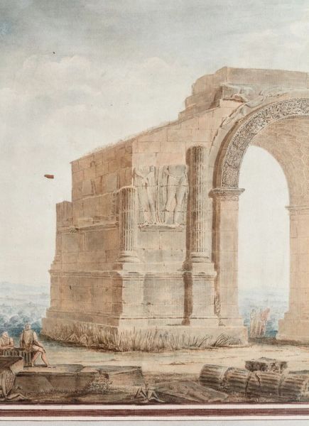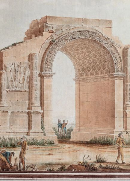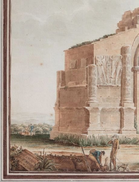 Depicting two sets of contemporary visitors (Roman, and likely 19th Century) to the Triumphal Arch of Glanum, one half of the famously preserved Roman monuments ‘Les Antiques’, outside Saint-Rémy-de-Provence, within the magnificent setting below a gorge on the flanks of the Alpilles mountains.