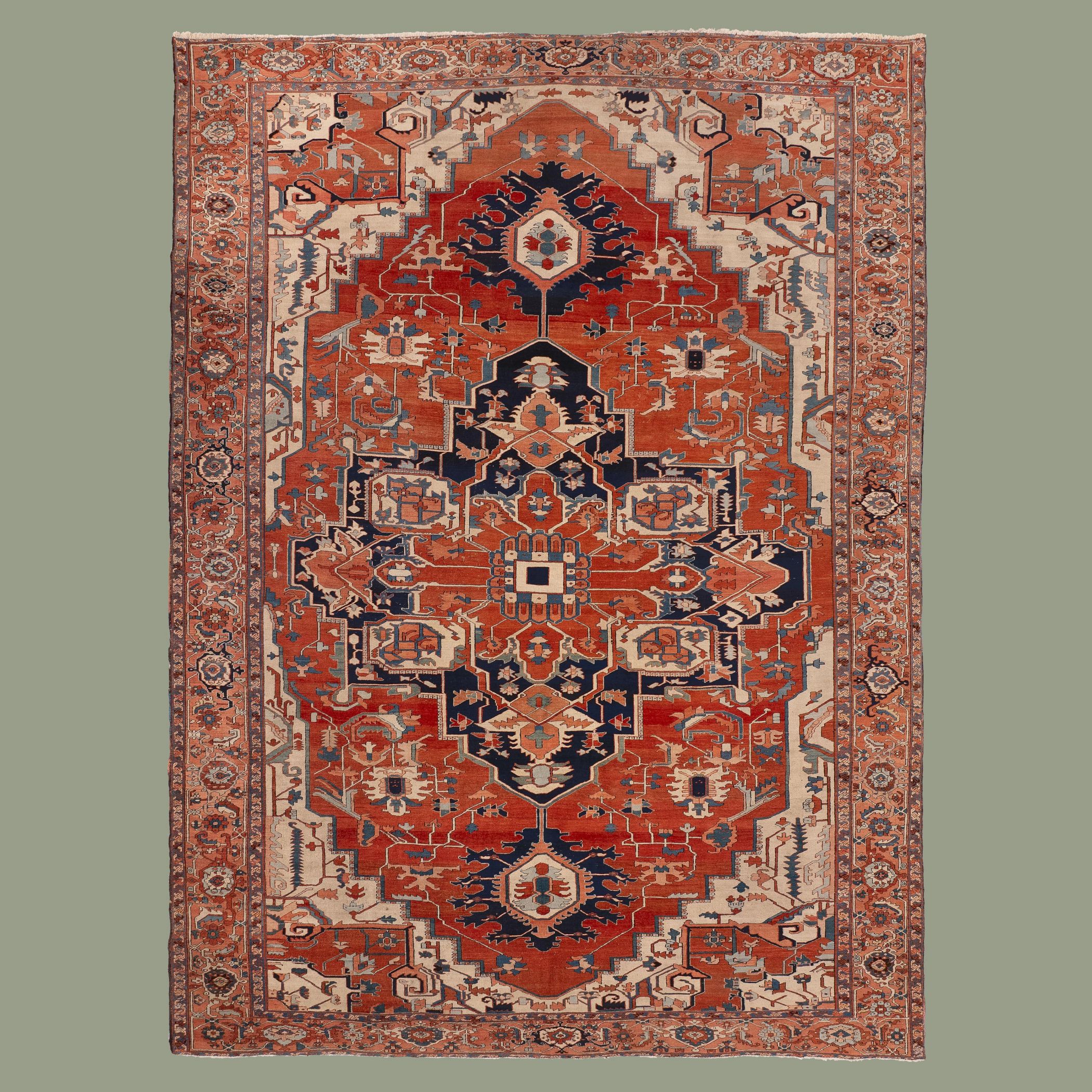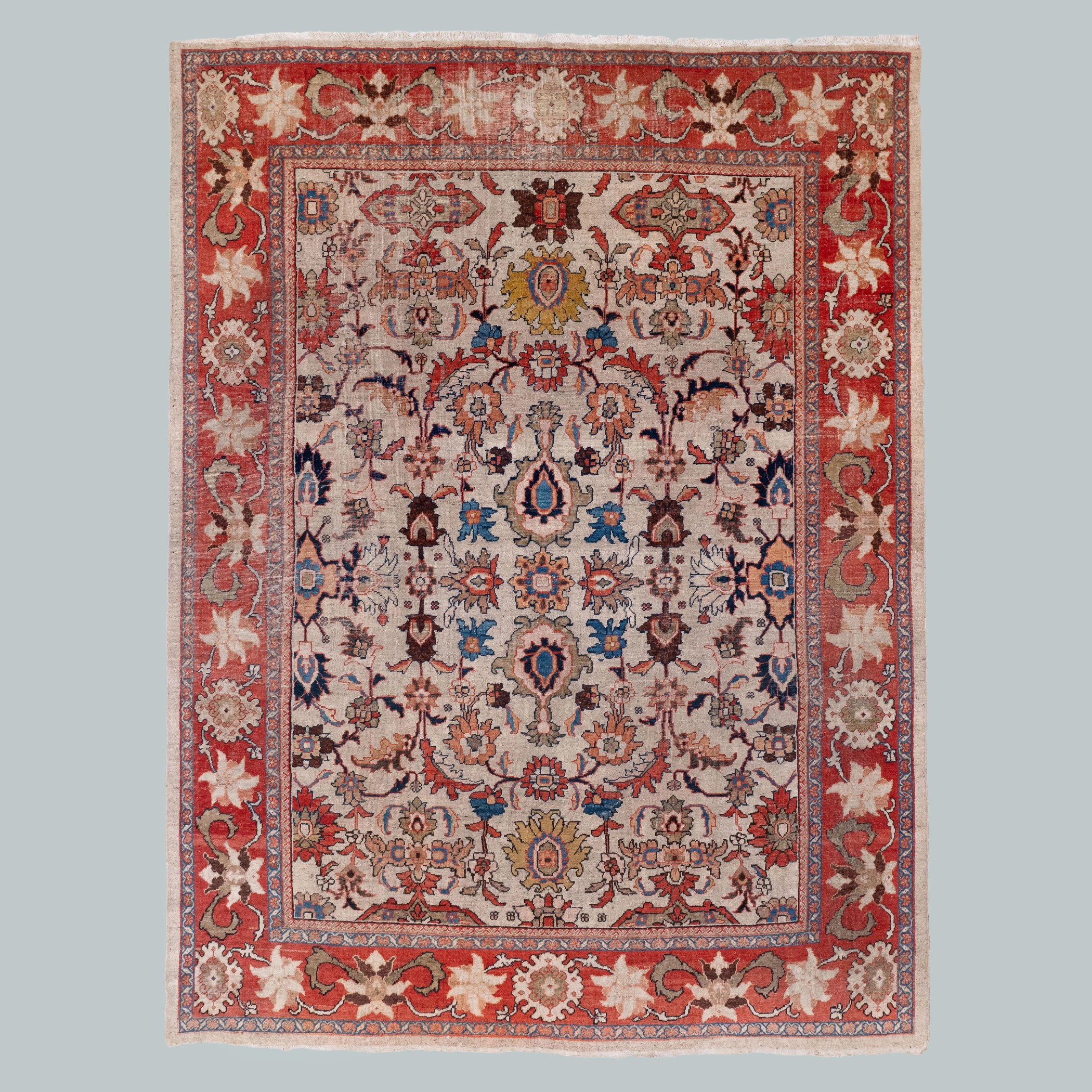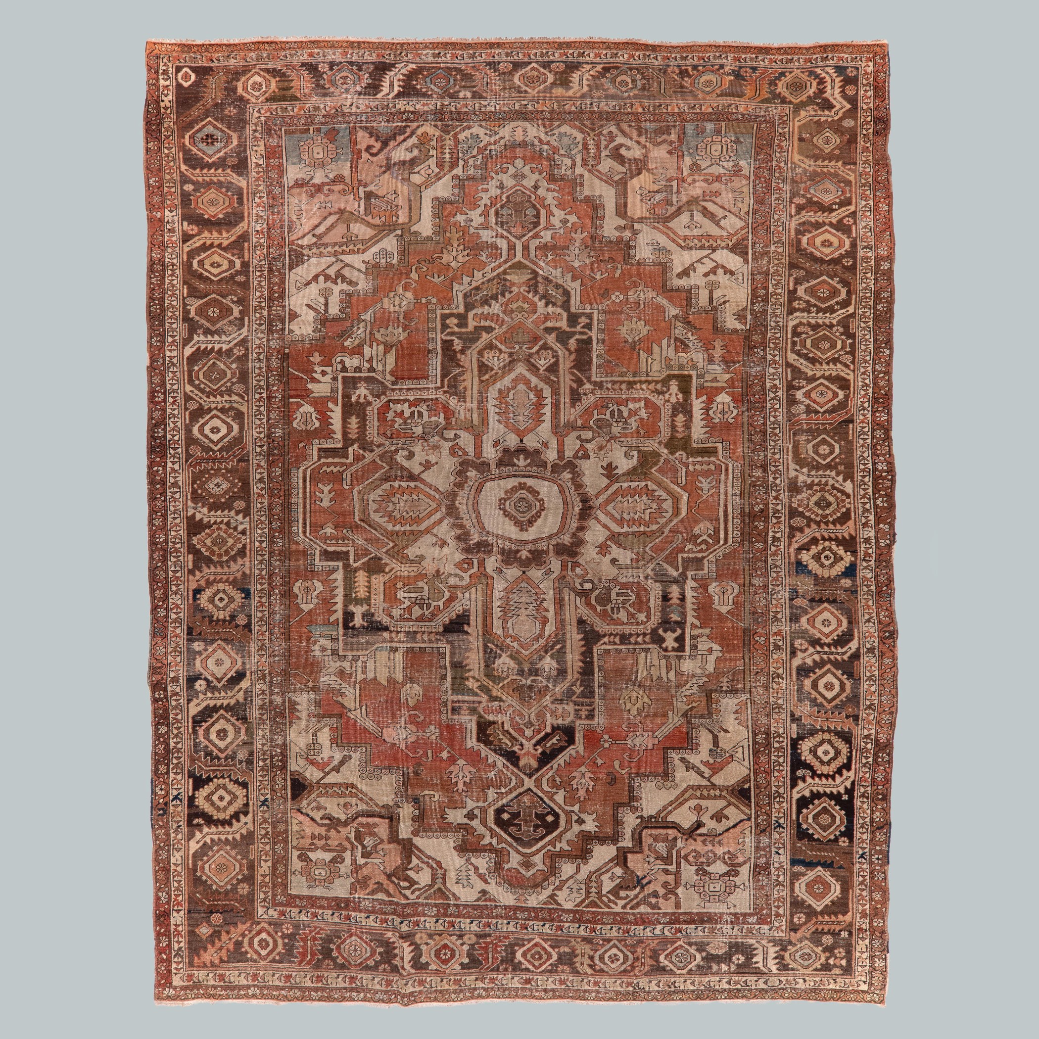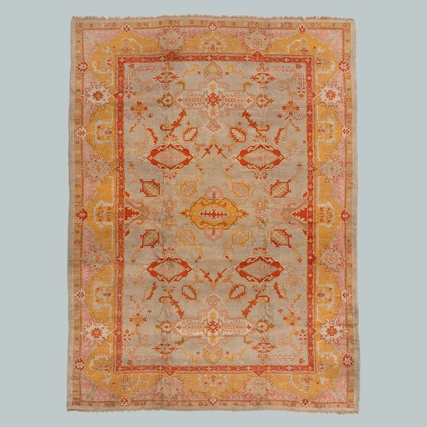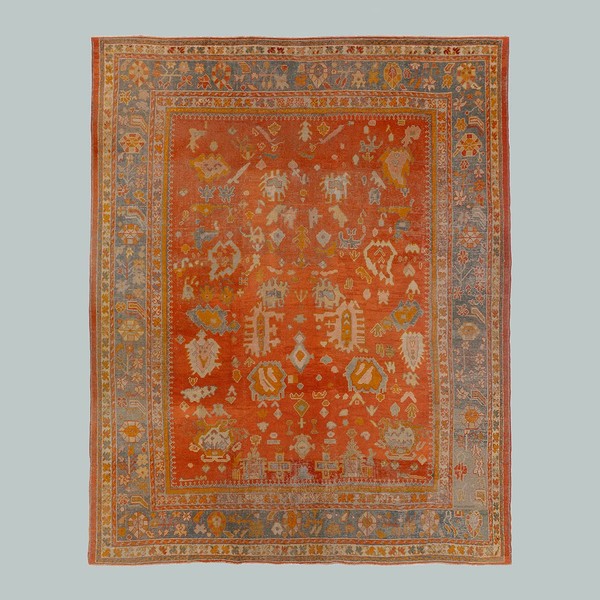 Our collection of antique Persian and Turkish carpets features Oushak, Heriz, Ziegler, and Caucasian designs, balancing muted surfaces and practicality.