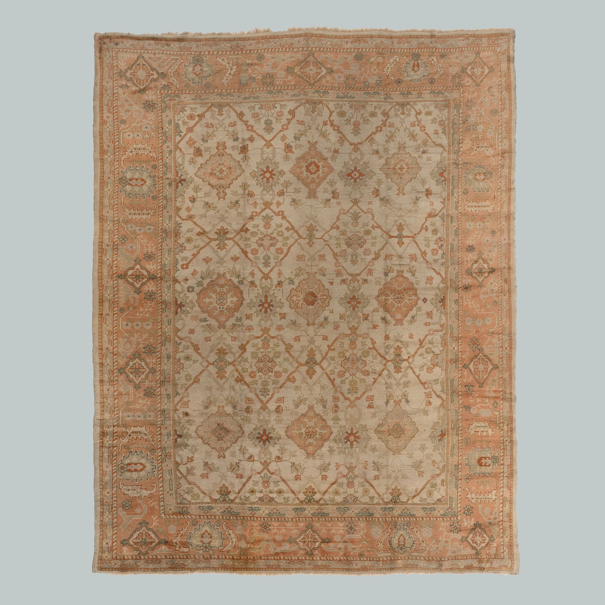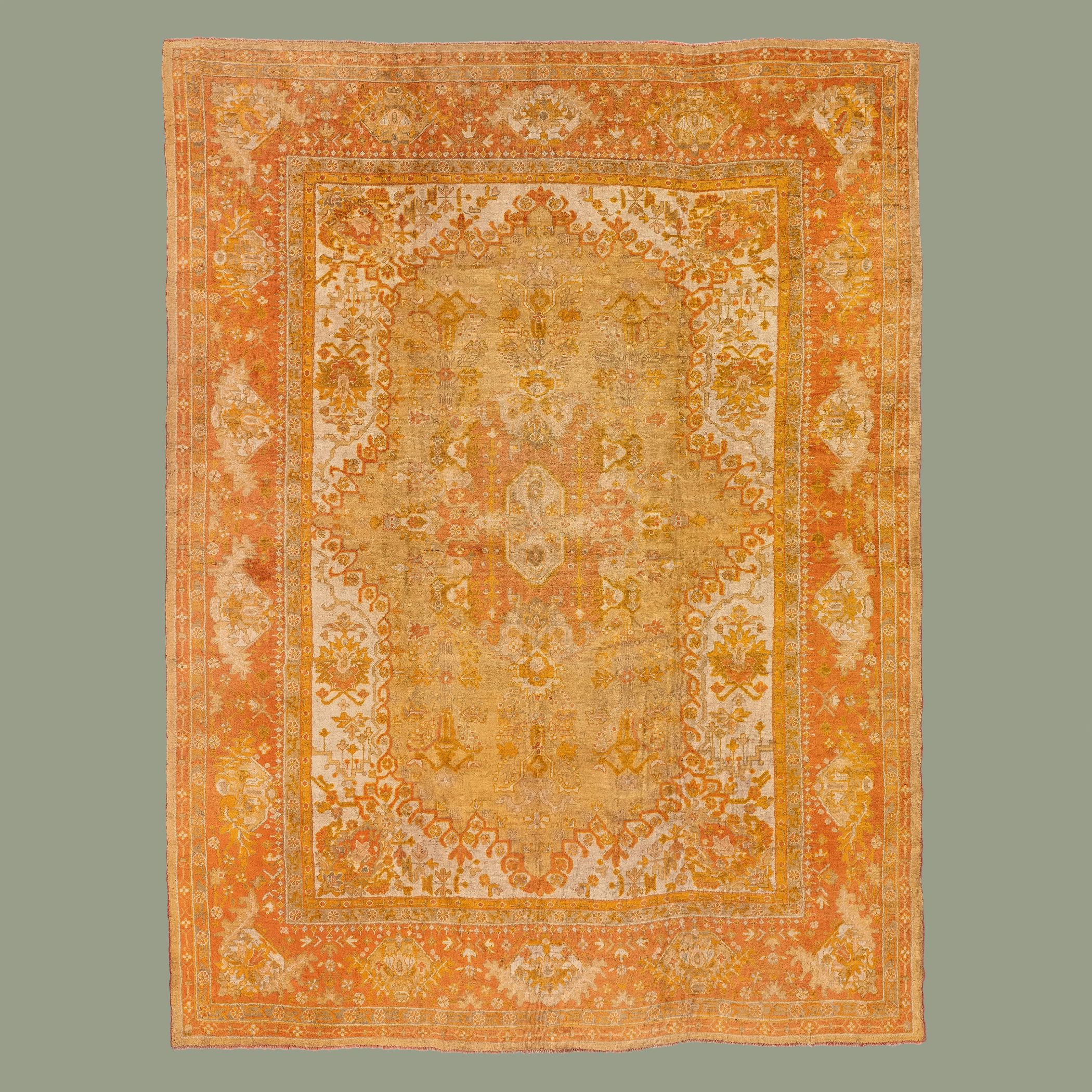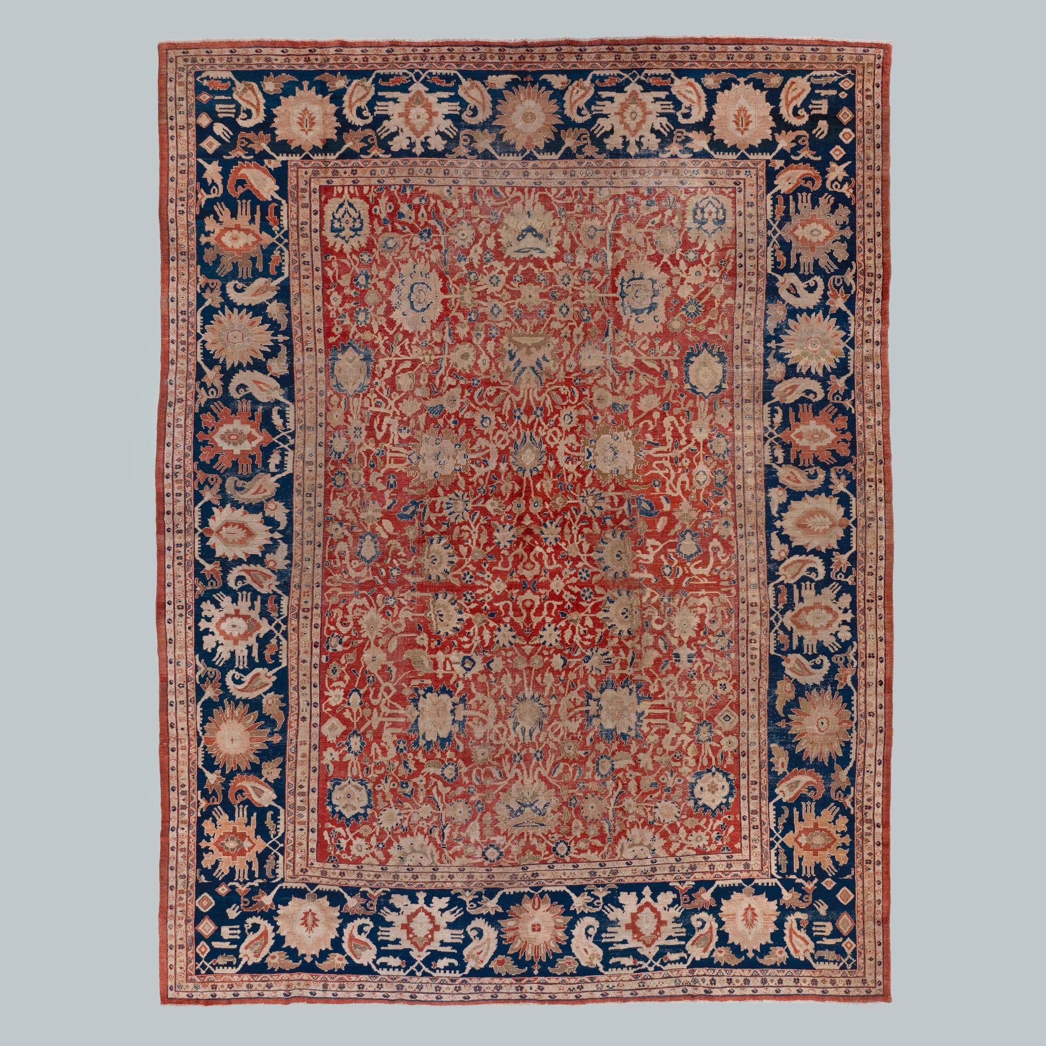 Our collection of antique Persian and Turkish carpets features Oushak, Heriz, Ziegler, and Caucasian designs, balancing muted surfaces and practicality.