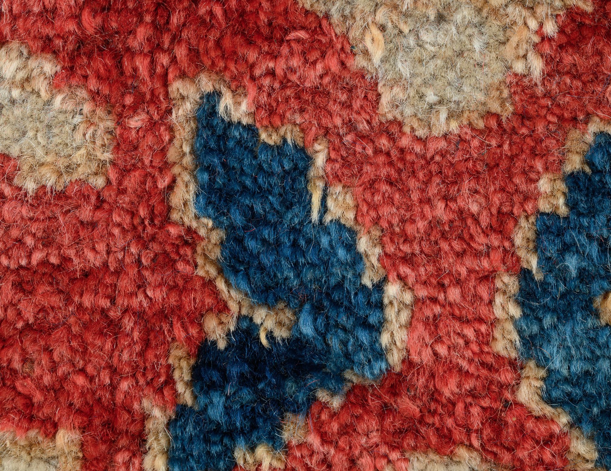 A deep blue-black border, adorned with clear, bold floral motifs, encircles a rich red field, decorated with a tightly wound, calligraphic, linear pattern in pale brown. Almost certainly by Ziegler & Co. Carpet, Sultanabad, c.1880.