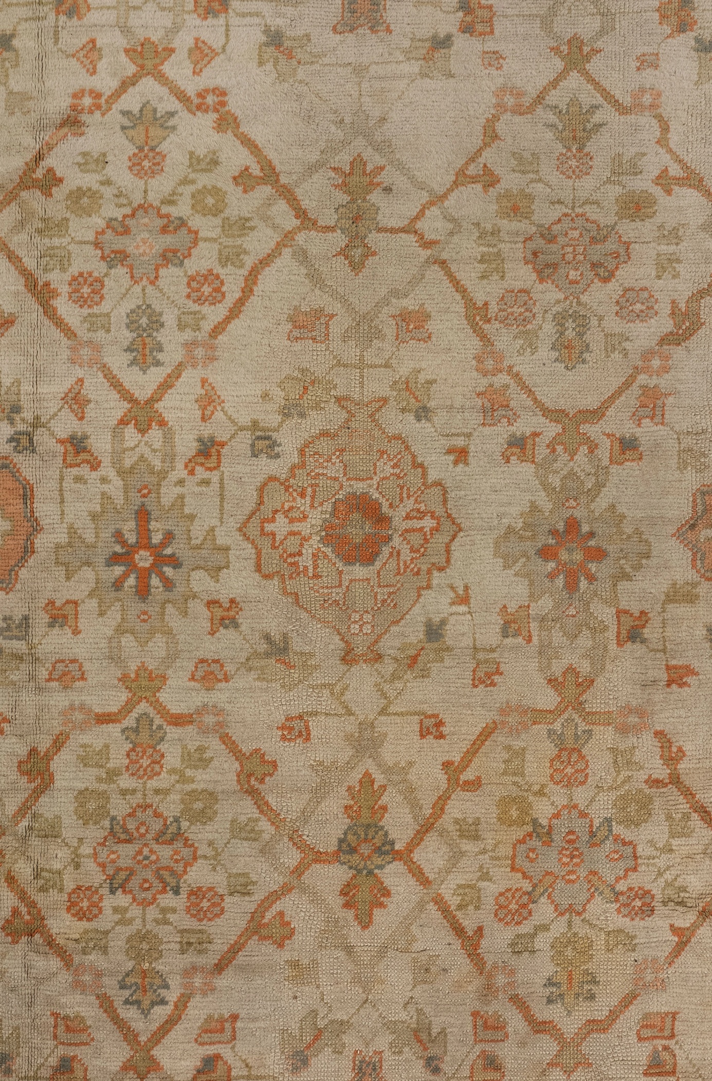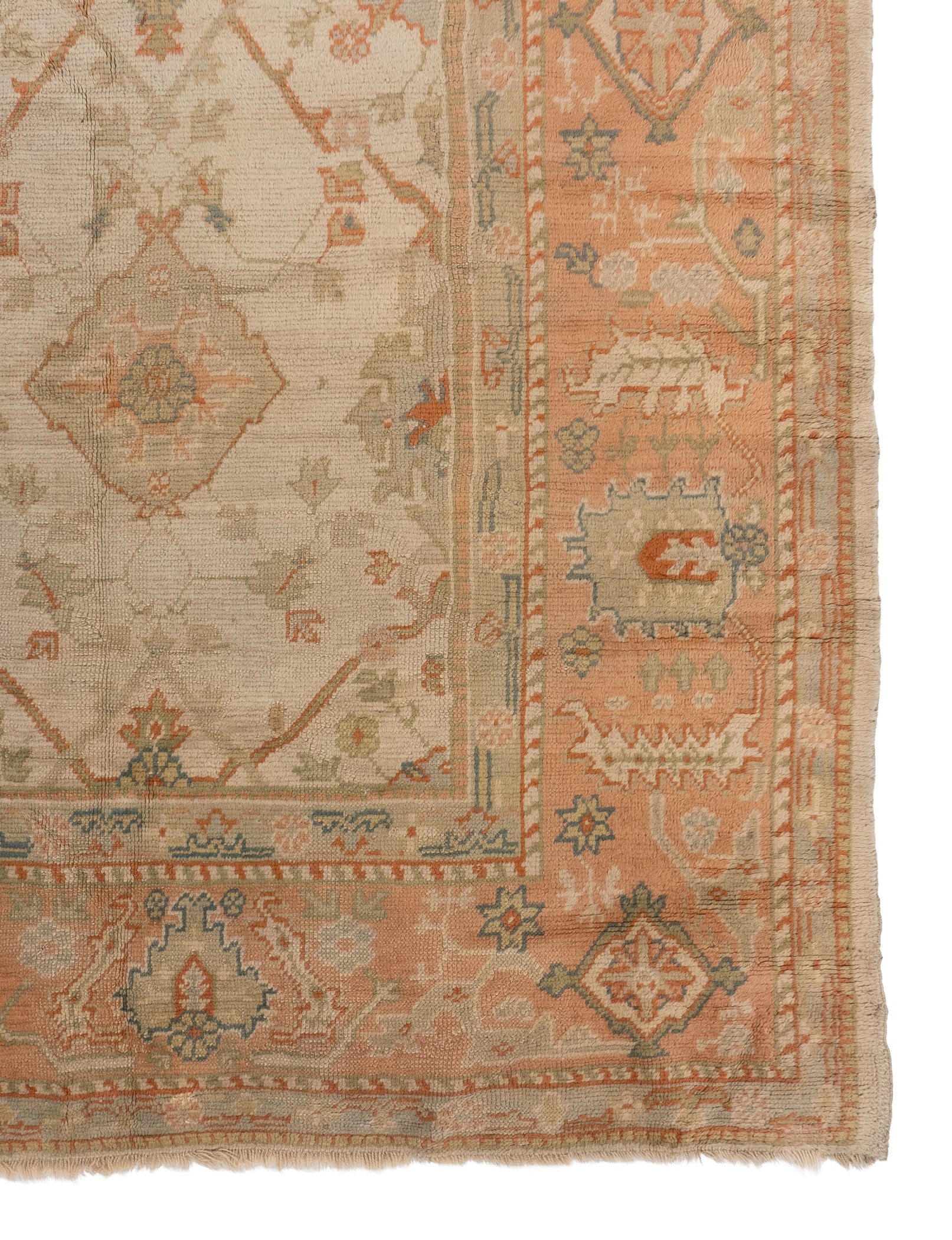 Of substantial but versatile scale, the overall palette muted, and comprising a finely wrought, trellis design interspersed with palmettes, typical of the Oushak form. The guard border is excellently conceived, featuring further palmettes and wonderfully decorated with dahlia and acanthus.