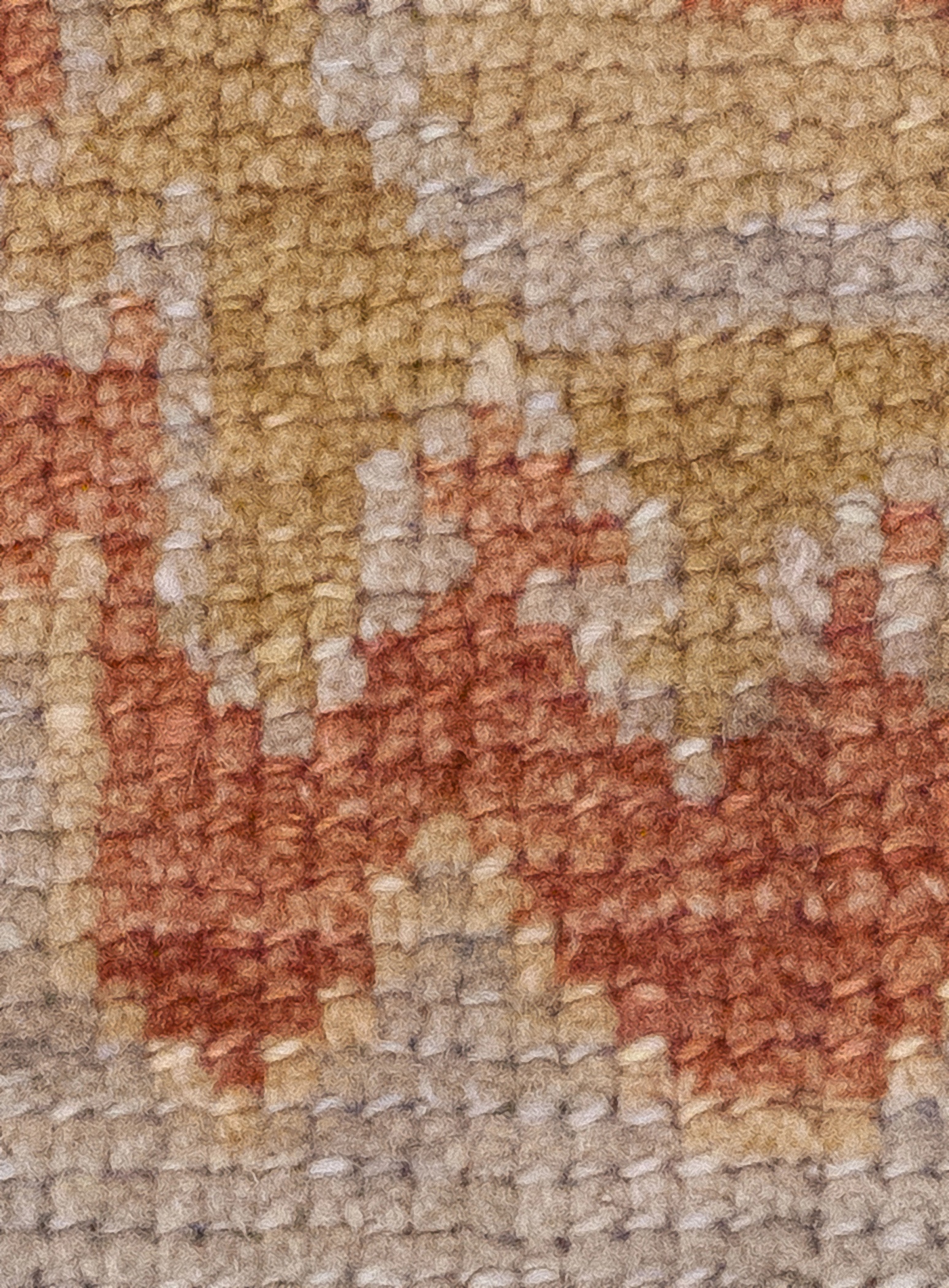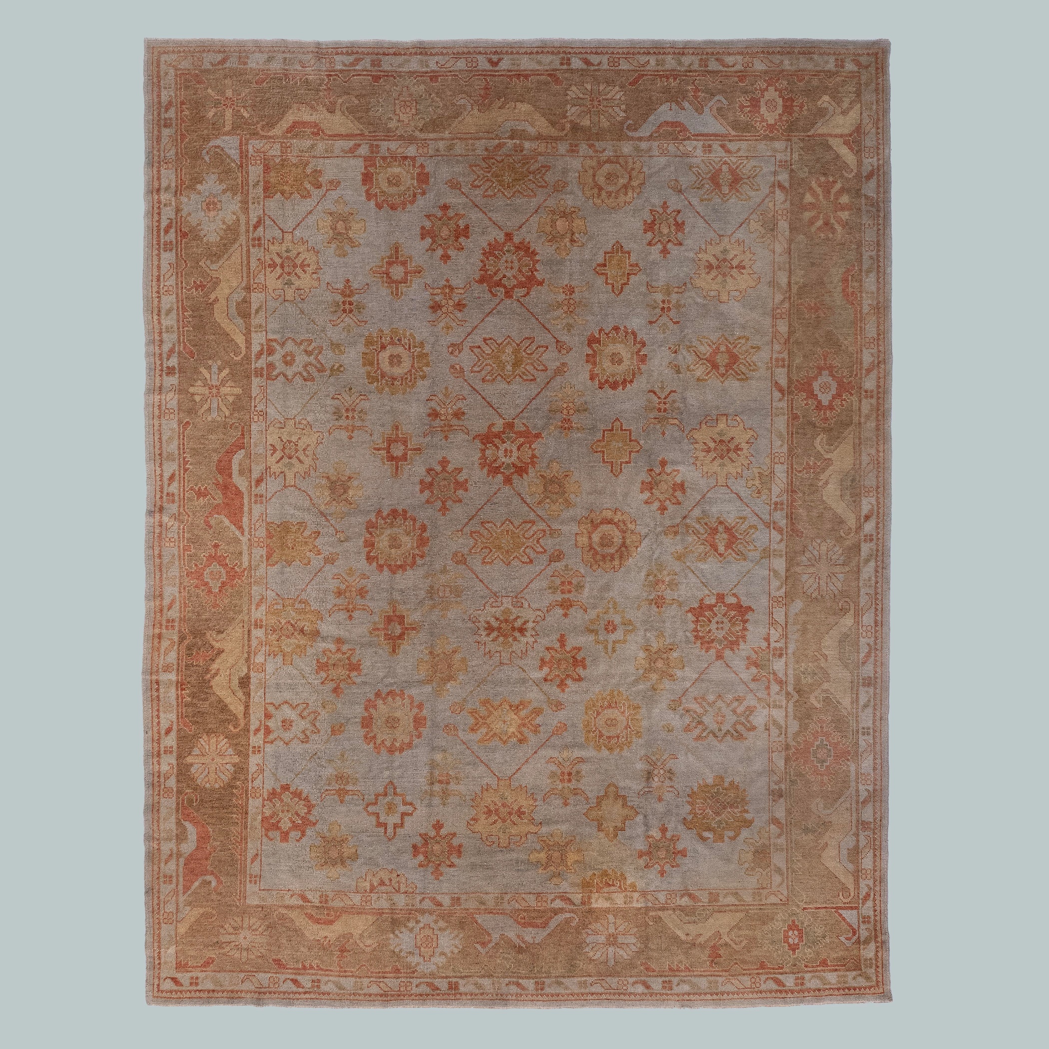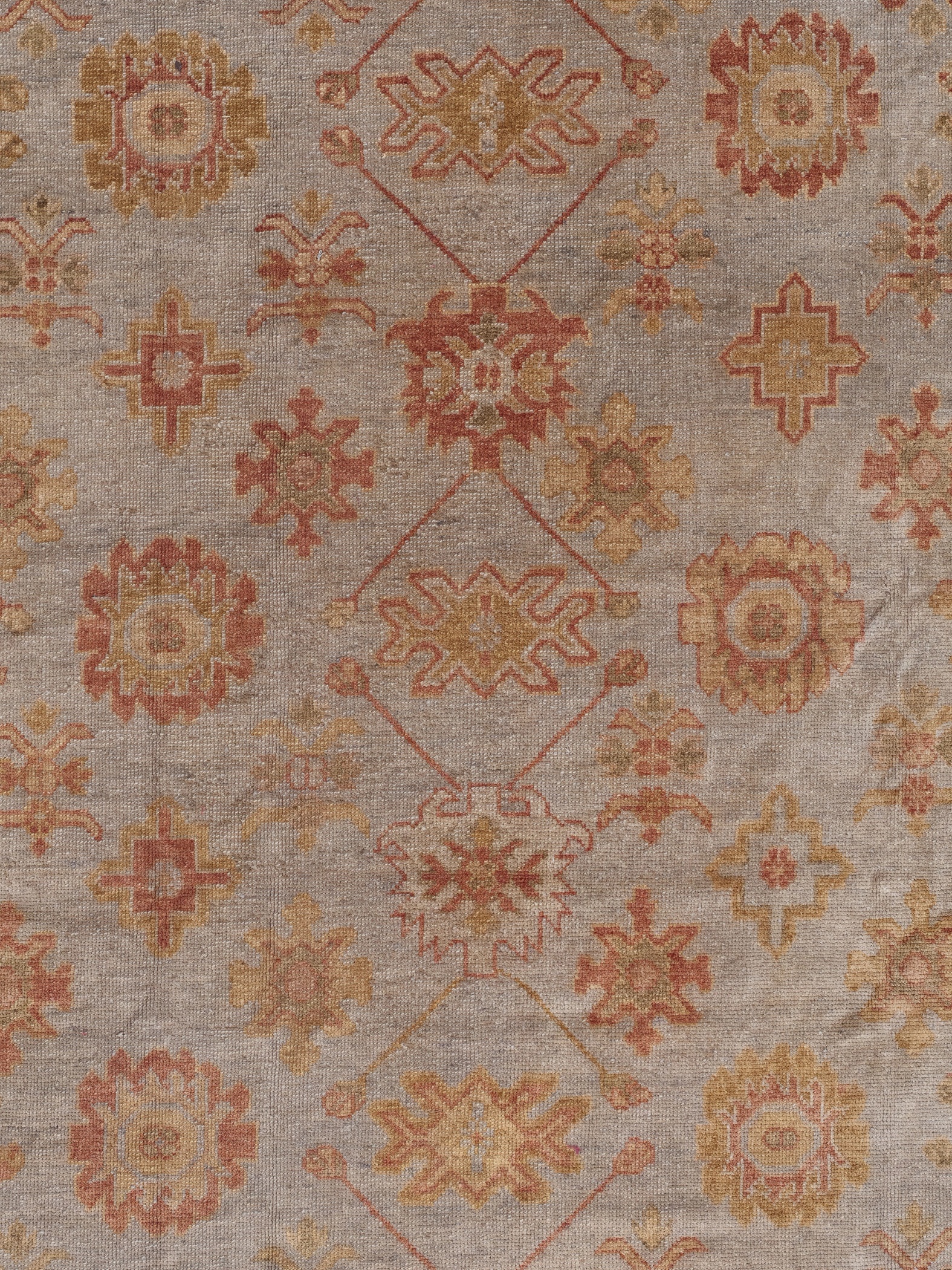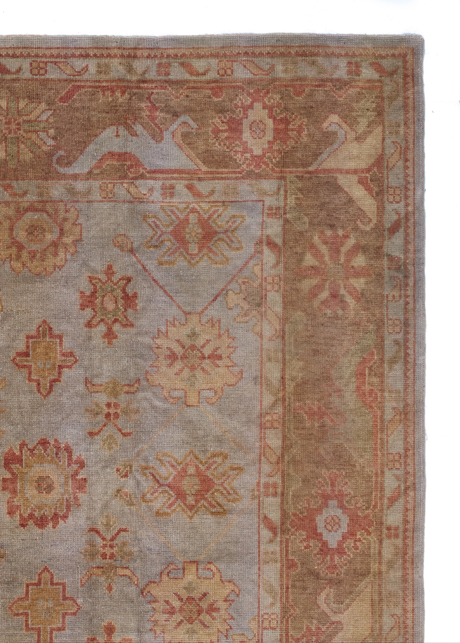 An Anatolian carpet of pleasing tone, with rich saffron and yellow ochre medallions and palmettes on a drab field, enclosed within a darker brown border, featuring palmettes and what appear to be highly stylised animalian forms.