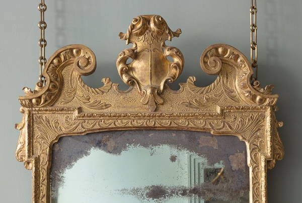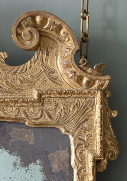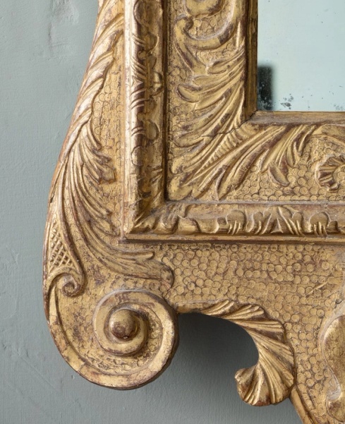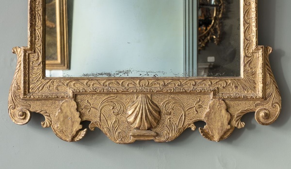 With broken swan neck pediment and central cartouche, the punched gesso frame enclosing a shaped foxed mercury plate, with foliate gesso cut apron and central scallop shell.