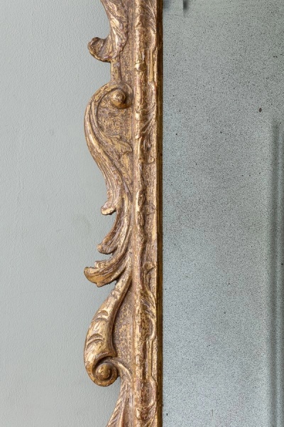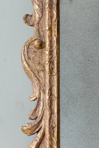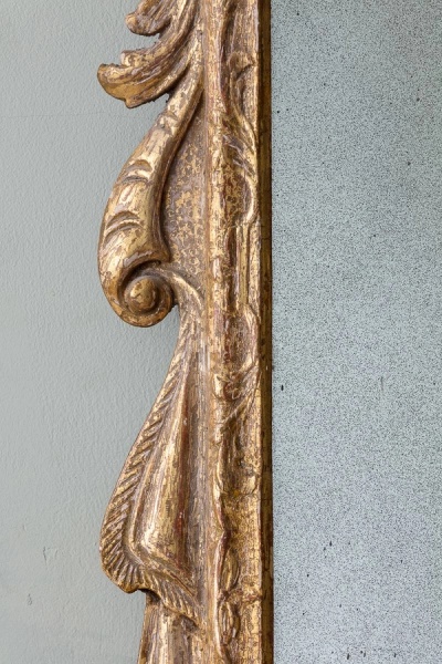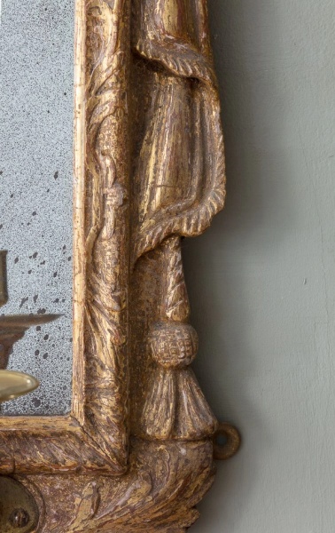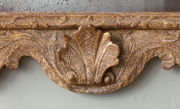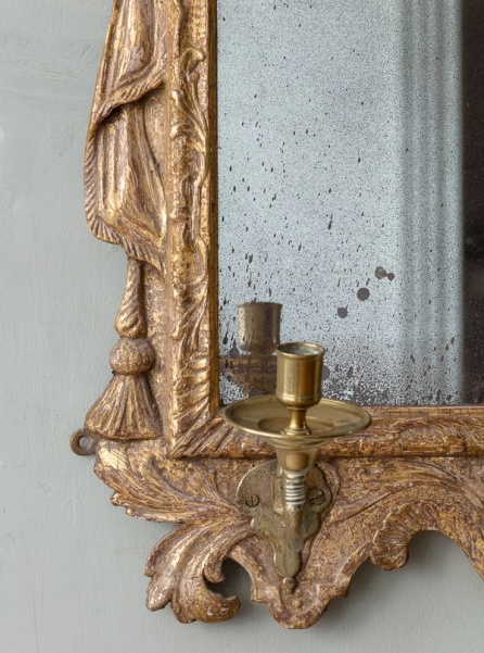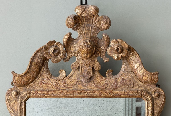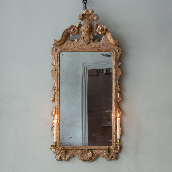 Of unusual and characterful form, with foliate carved and cherub cresting between broken swan neck pediment, over a bevelled plate and two later brass candle sconces.