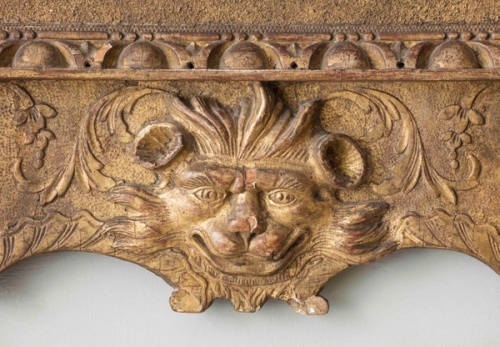 The rectangular bevelled plate within a gadrooned edge and egg-and-dart border, surmounted by a floral-carved broken pediment centred by a foliate cartouche, the punched apron decorated with foliate scrolls and centred by a lion’s mask.