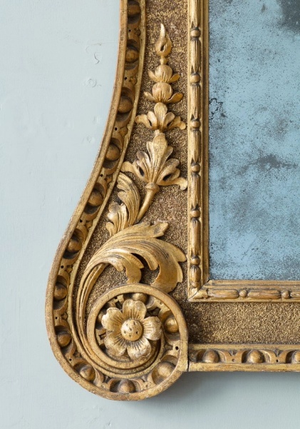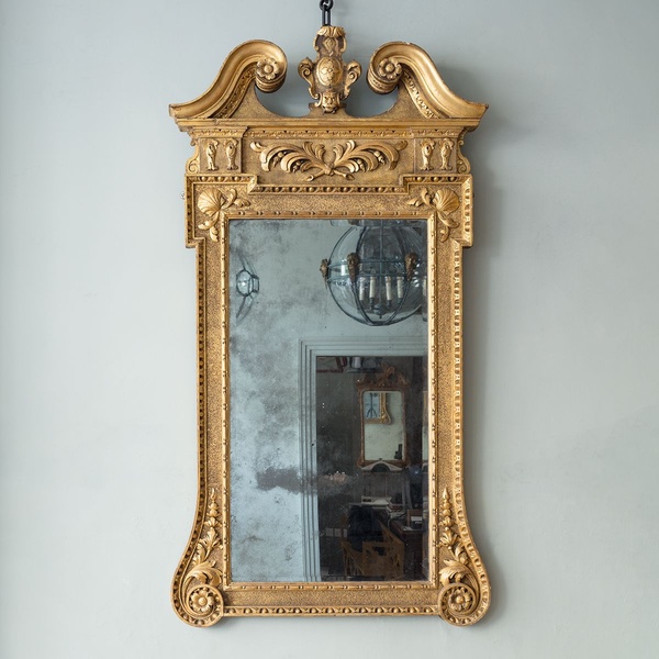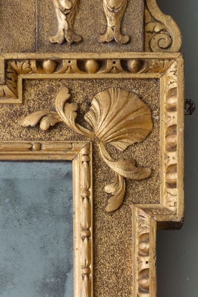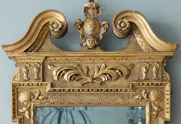 With broken swan neck pediment, with central small scale carved mask cartouche above a tied stiff palm leaf motif, the framed re entrant corners with scallop shells, enclosing a lightly foxed mercury bevelled mirror plate.