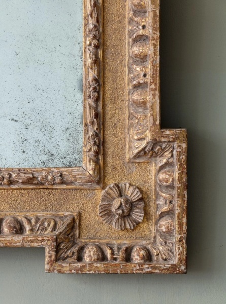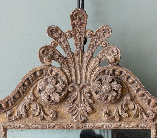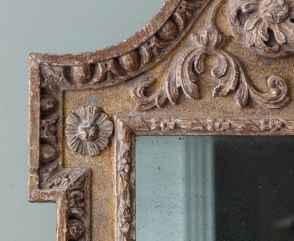 The quintessential Goodison designed egg and dart frame, with re entrant corners adorned with modestly carved flower motifs, with generously drawn scallop and foliate carved cresting, carefully dry stripped to reveal original giltwood and sand gilded surface, enclosing a lightly foxed mercury mirror plate.