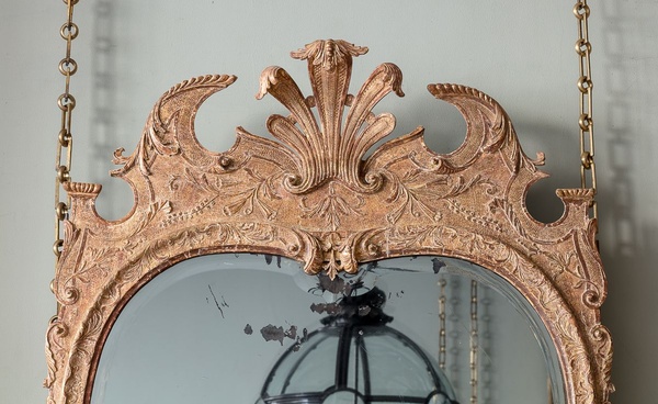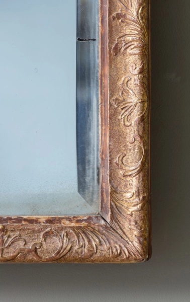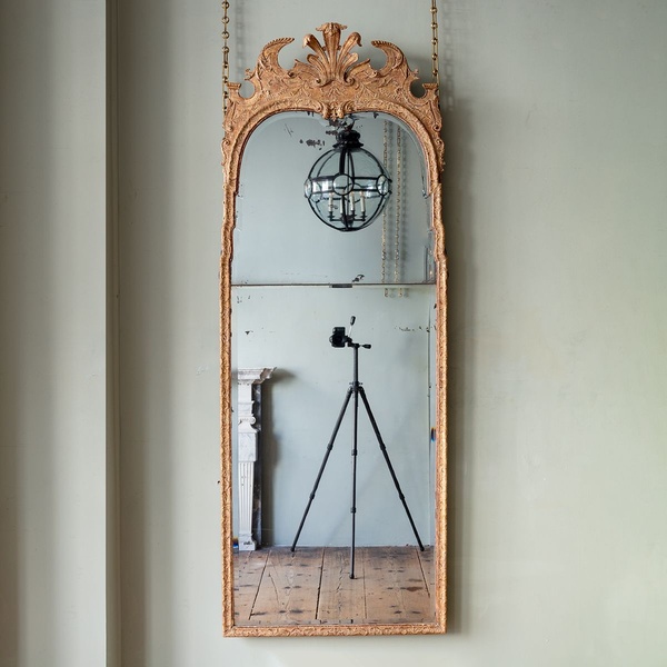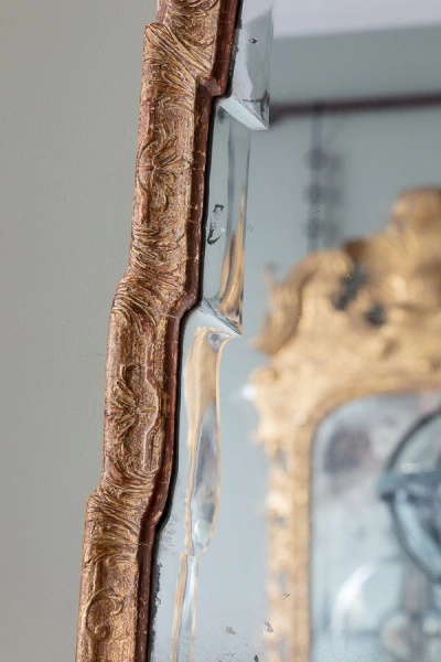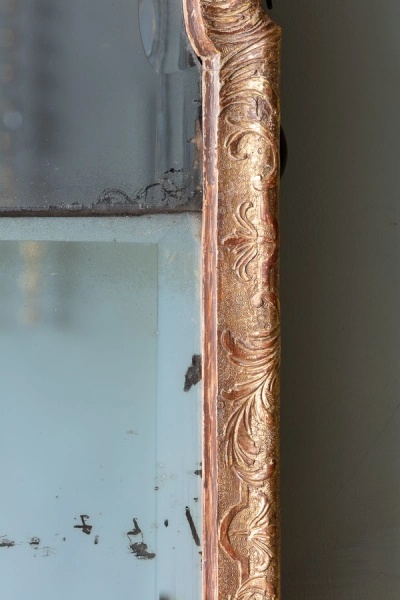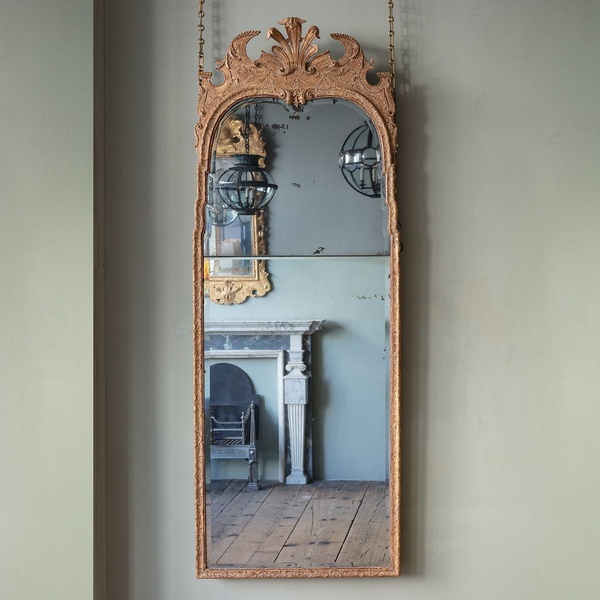 This sophisticated pier mirror can be attributed on stylistic grounds to John Belchier (fl.1699 – d.1753). Described by a contemporary as ‘a very eminent cabinetmaker’, he is recorded with premises at ‘The Sun’ on the south side of St. Paul’s Churchyard London from at least 1717. Renowned for supplying mirrors, one of his printed trade bills records that he was making up and providing ‘all sorts of fine Peer and Chimney-Glasses and Glass Sconces’ (Ed. Geoffrey Beard and Christopher Gilbert, Dictionary of English Furniture Makers 1660-1840, Furniture History Society, Leeds, 1986, pp. 59-60). Belchier’s most significant known commissions include the provision of mirrors to St. Paul’s Cathedral and during the same period, between 1722 and 26, of pier glasses and furniture to John Meller at Erddig in Clwyd, North Wales. Of the extant mirrors at Erdigg, one in carved and gilded gesso and of the ‘most expensive glass’ at a cost of £50 was installed in the Best Bedchamber. The flattened arch to the top of the Erddig mirror incorporates a bold double-scroll flourish that is reflected in the ornamentation of the example offered here (Adam Bowett, Early Georgian Furniture 1715-1740, Antique Collectors Club, Woodbridge, 2009, p. 292). A second mirror, on a less impressive scale but surmounted in a similar fashion and also attributed to Belchier was sold from the Pearson collection, Dunecht House, Aberdeen, in that case the plume was centred by a mask.