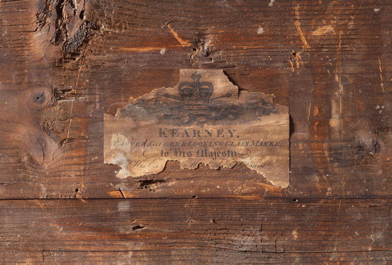 The reverse of the mirror bears a label for ‘H Kearney’, carver, gilder and looking glass maker to his majesty. The design of this mirror is identical to known autograph Booker mirrors, and one can assume Kearny was operating in this instance as a retailer.