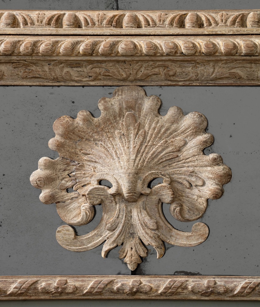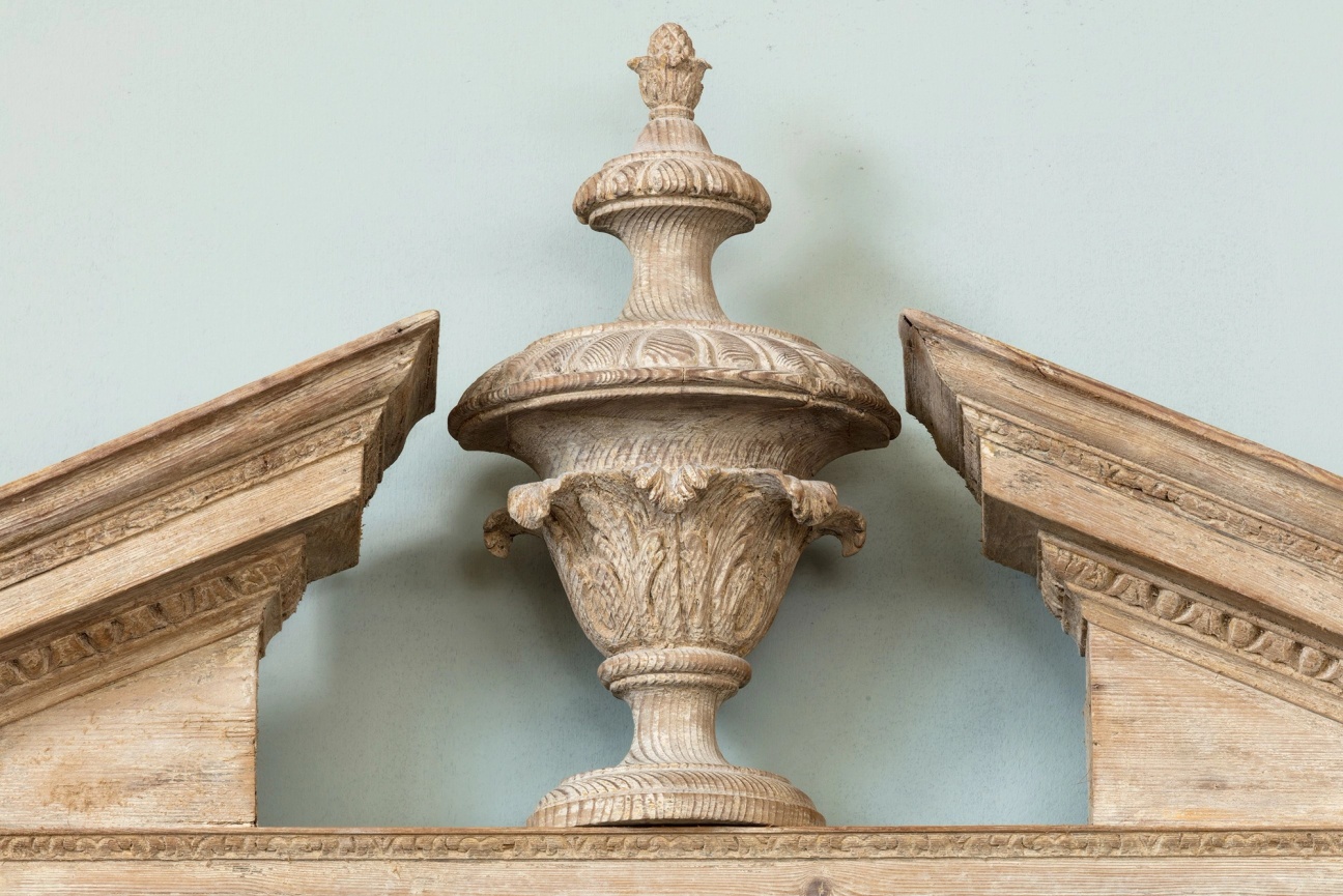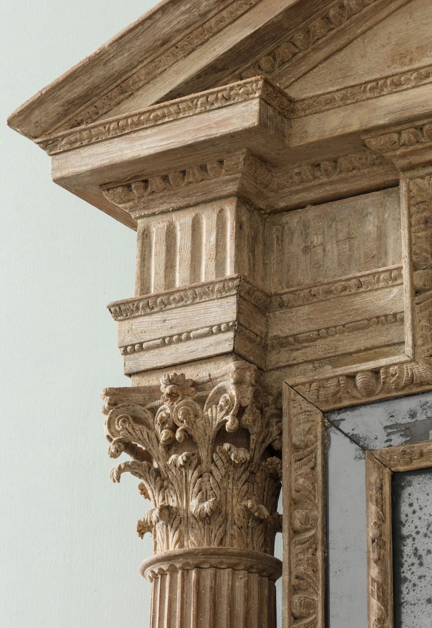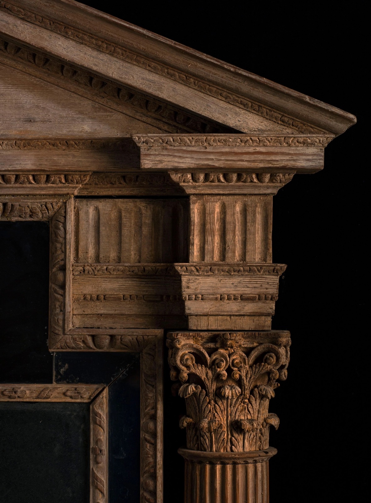 Surmounted by a triangular broken arch pediment centred by an urn above a dentil cornice and fluted frieze, the marginal plates within two bold tapering fluted columns with Corinthian capitals, the lower frieze with central leaf clasp, flanked by inbicrated corbels – Irish c.1775.