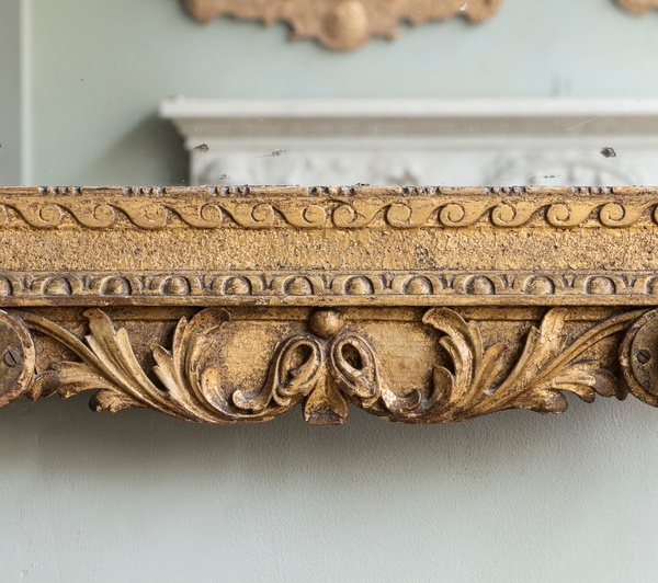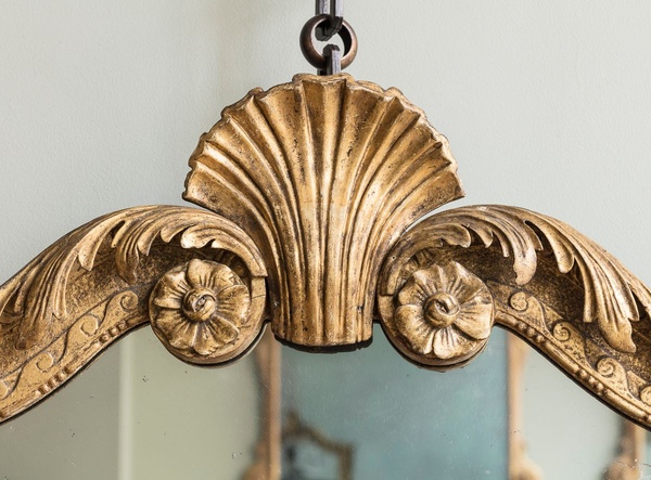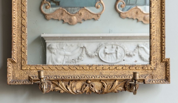 The mercury arched plate enclosed by a shell cresting, centring a scroll and acanthus carved cartouche above an egg and dart mounted re-entrant frame. With swan neck scrolling brass candle sconces.