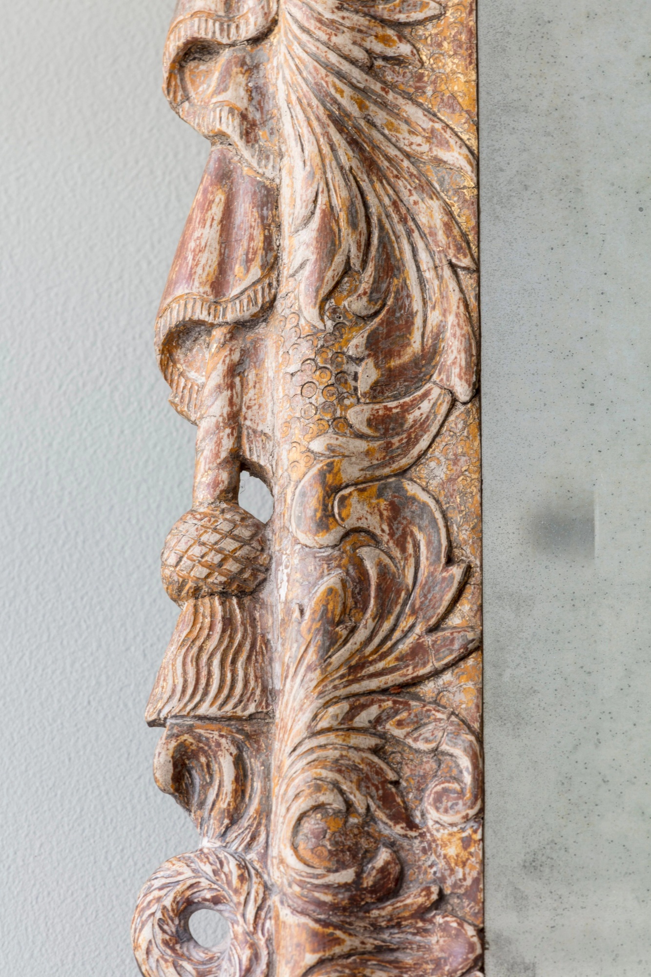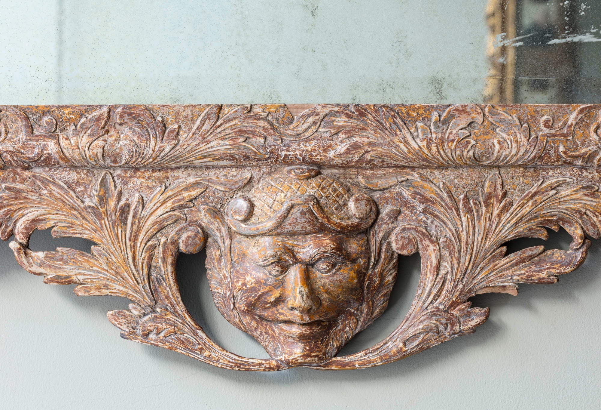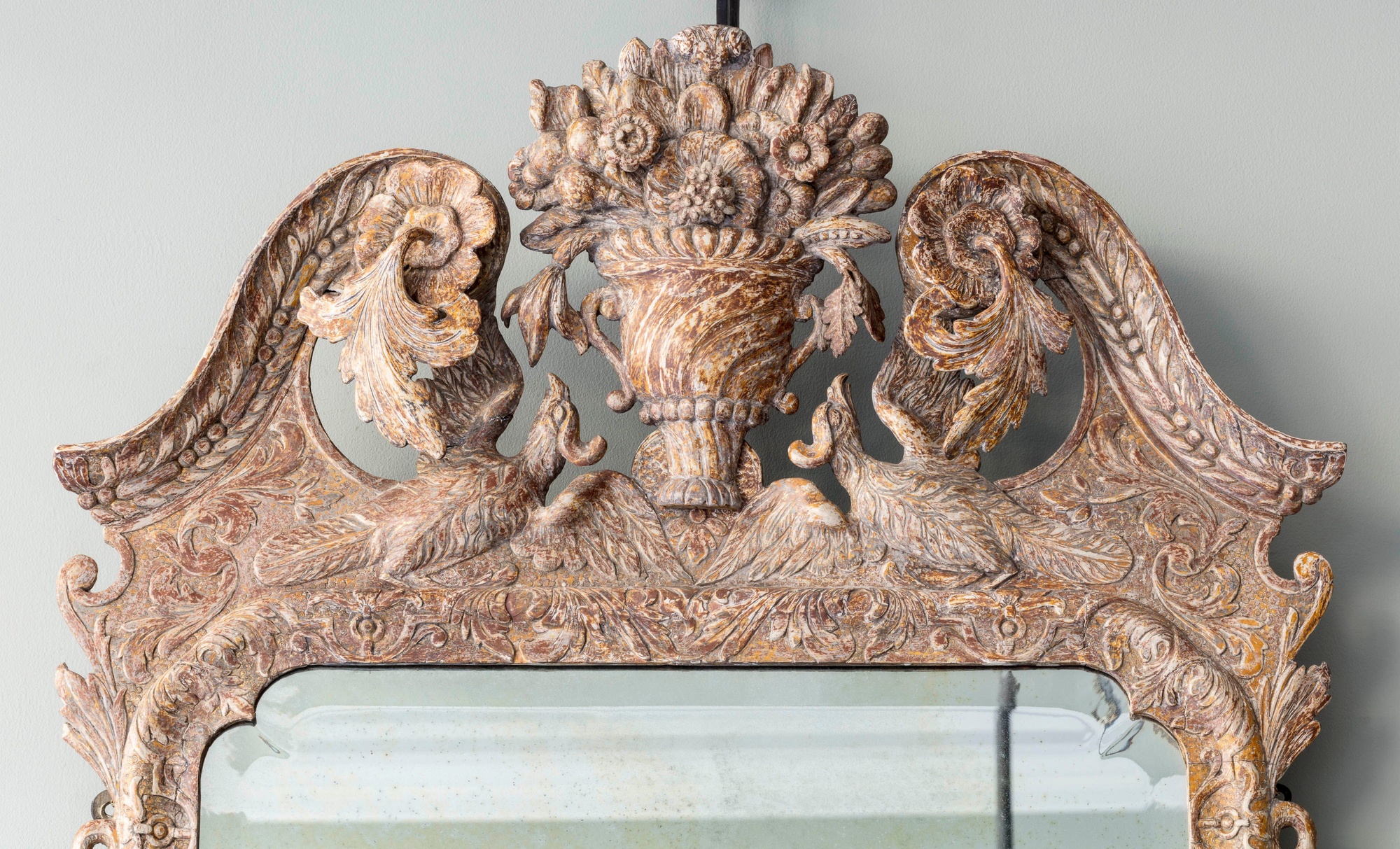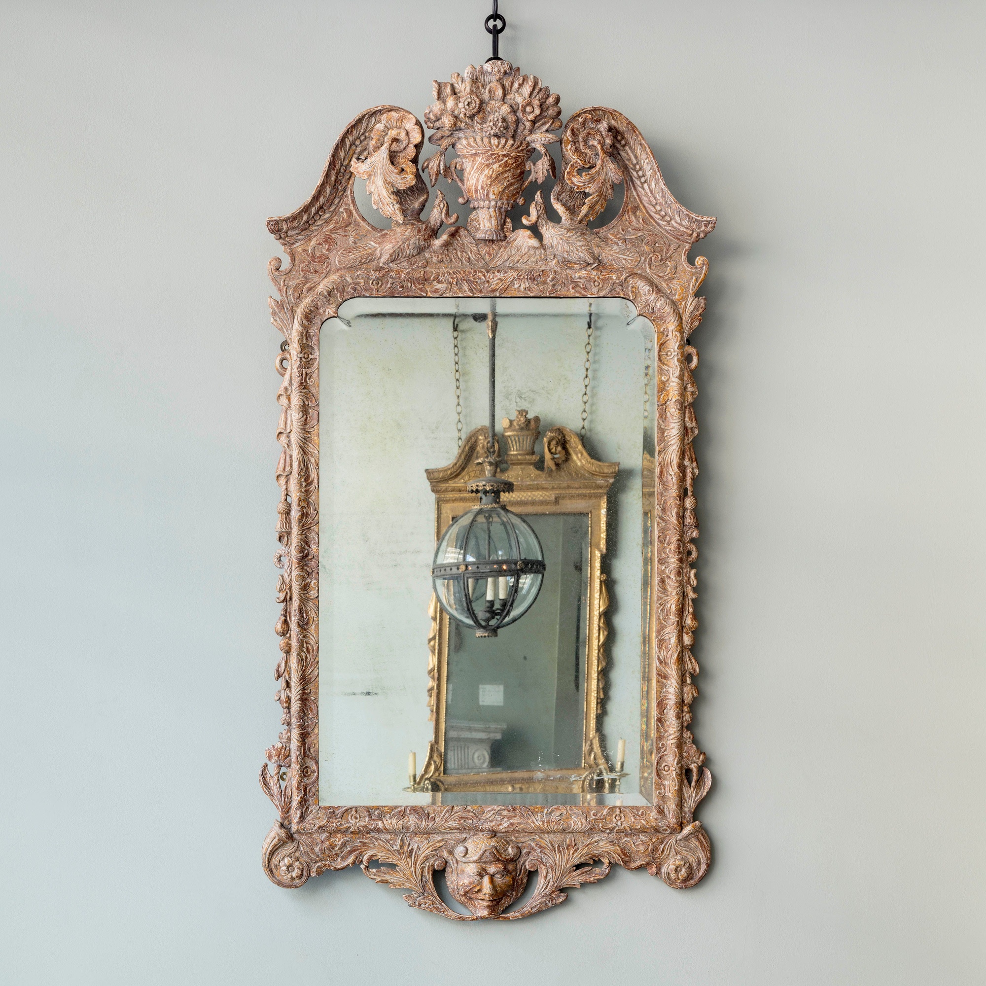 Retaining its original gilding, the swan neck top mounted with carved rosettes and trailing acanthus outside a central basket of flowers above swooping birds. The later rectangular bevelled plate supported by carved drapes tassels and serpents, above an apron with a central Chinese mask encased with flowing acanthus leaves. Irish c.1740