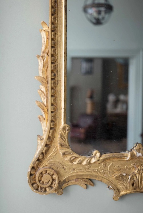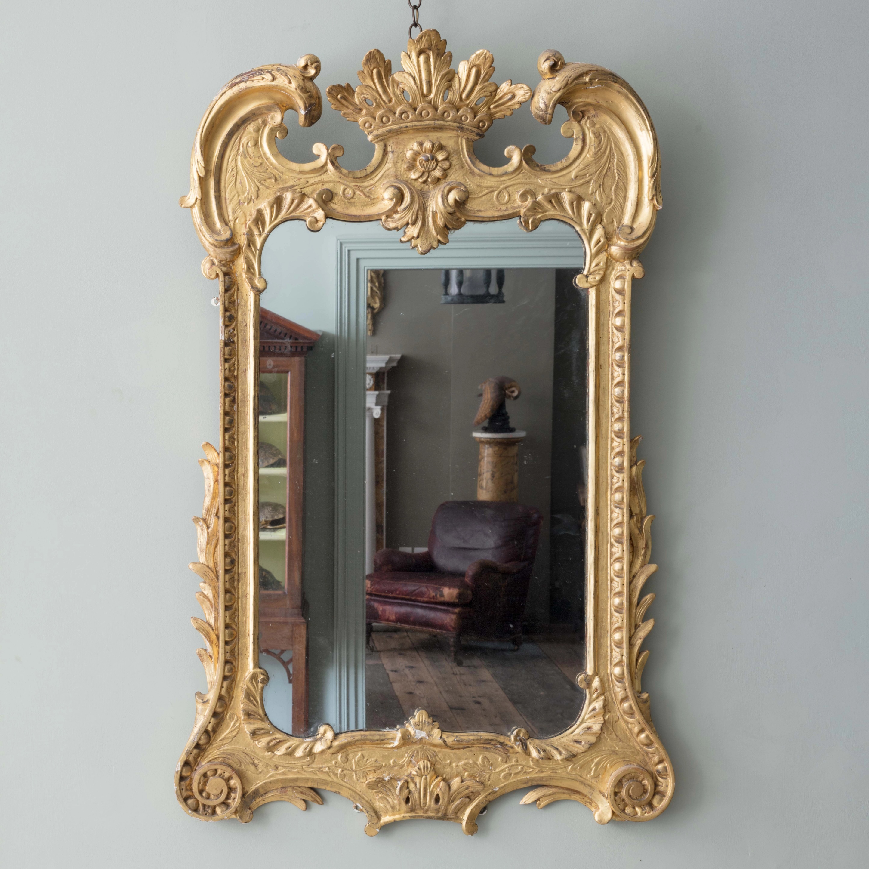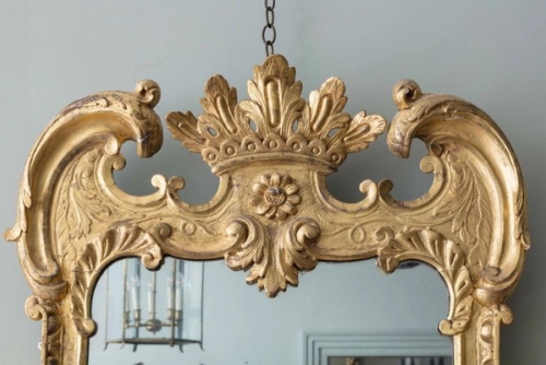 With scroll arch pediment surmounted by a coronet and C scrolls above a rectangular plate surrounded by a stiff leaf and acanthus decorated frame.