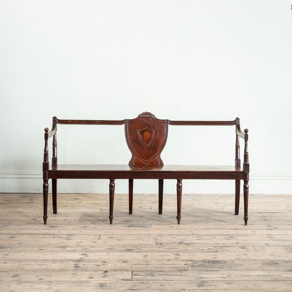 With slender moulded back rail, on turned arms on rectangular solid seat, with four turned and tapering front legs.