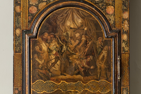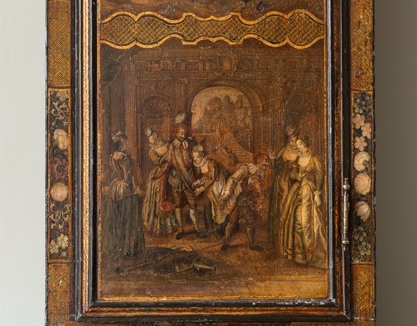 The decorative scheme reflects the period’s fascination with literature and the oriental exotic, associated with japanning. The use of Don Quixote, Europe’s most celebrated early modern novel, is particularly resonant, embodying themes of adventure and folly that appealed strongly in the eighteenth-century. Furthermore, the layering of decoupage with japanned surfaces here achieves a distinctive meeting of narrative art and ornamental finish.