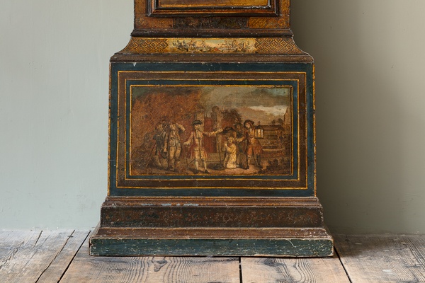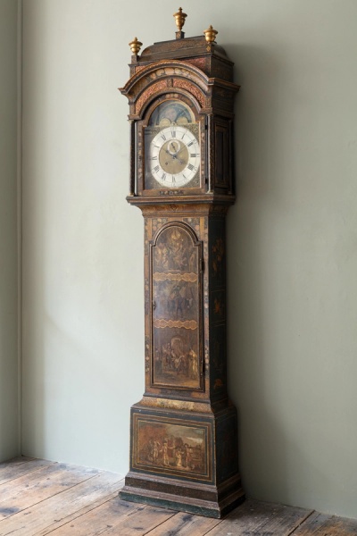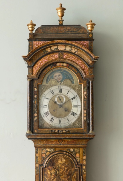 The side panels decorated with japanned scenes of oriental life, set against blue-toned lacquer grounds. The whole case presents a a rich and varied surface of striking visual and tonal depth.
