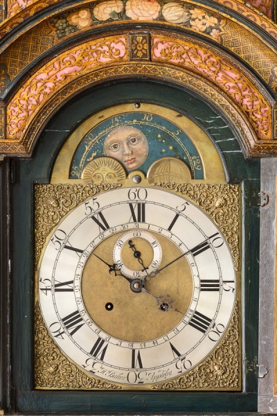 The arched brass dial is signed H. Baker, Appleby, and is a rare example of a ‘month-duration’ movement. Of further interest is the rolling moon dial with painted anthropomorphic full moon.