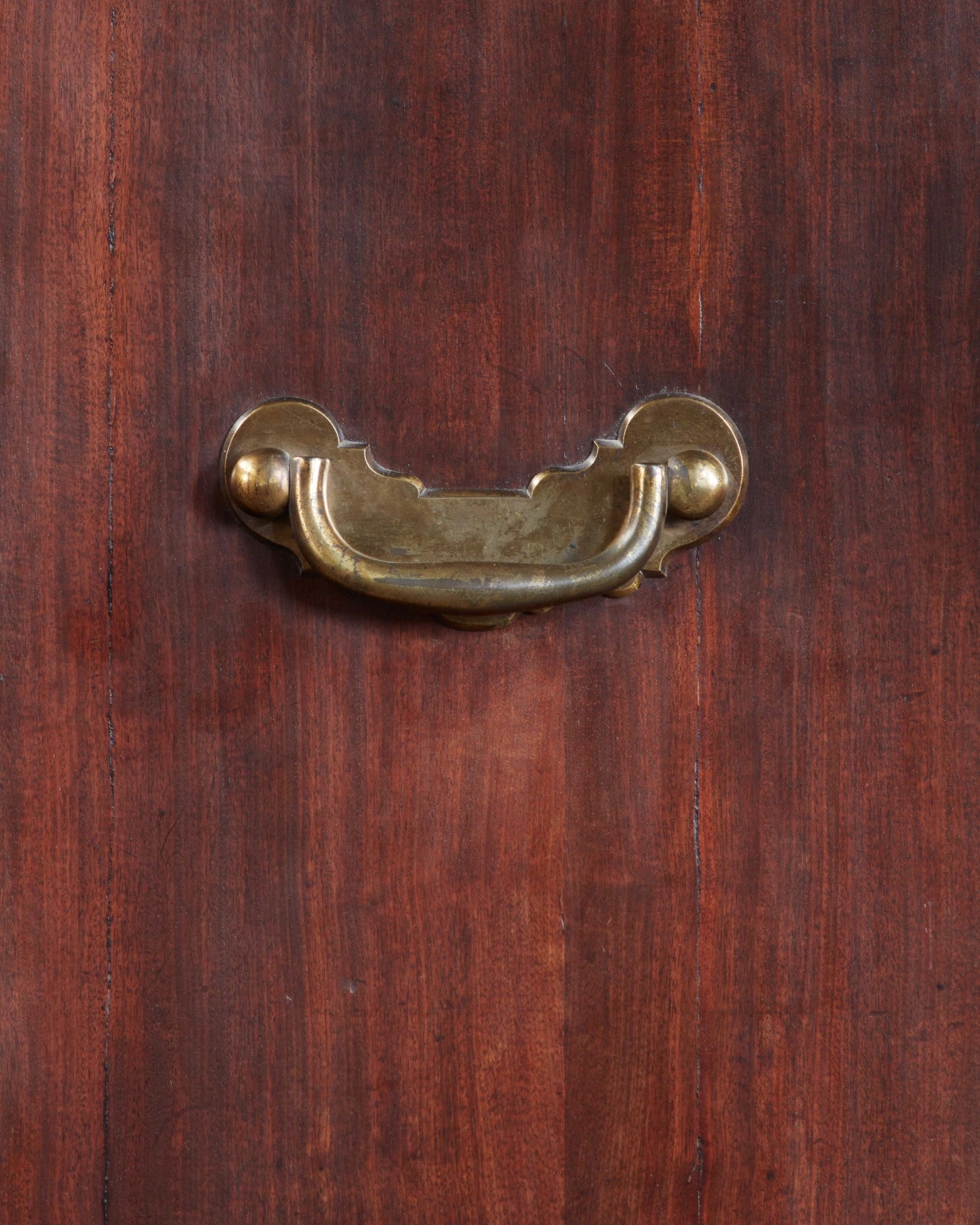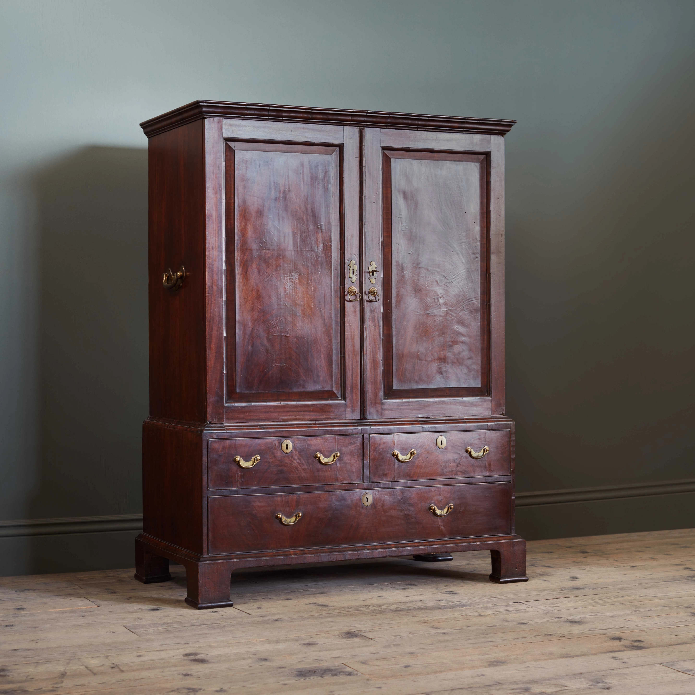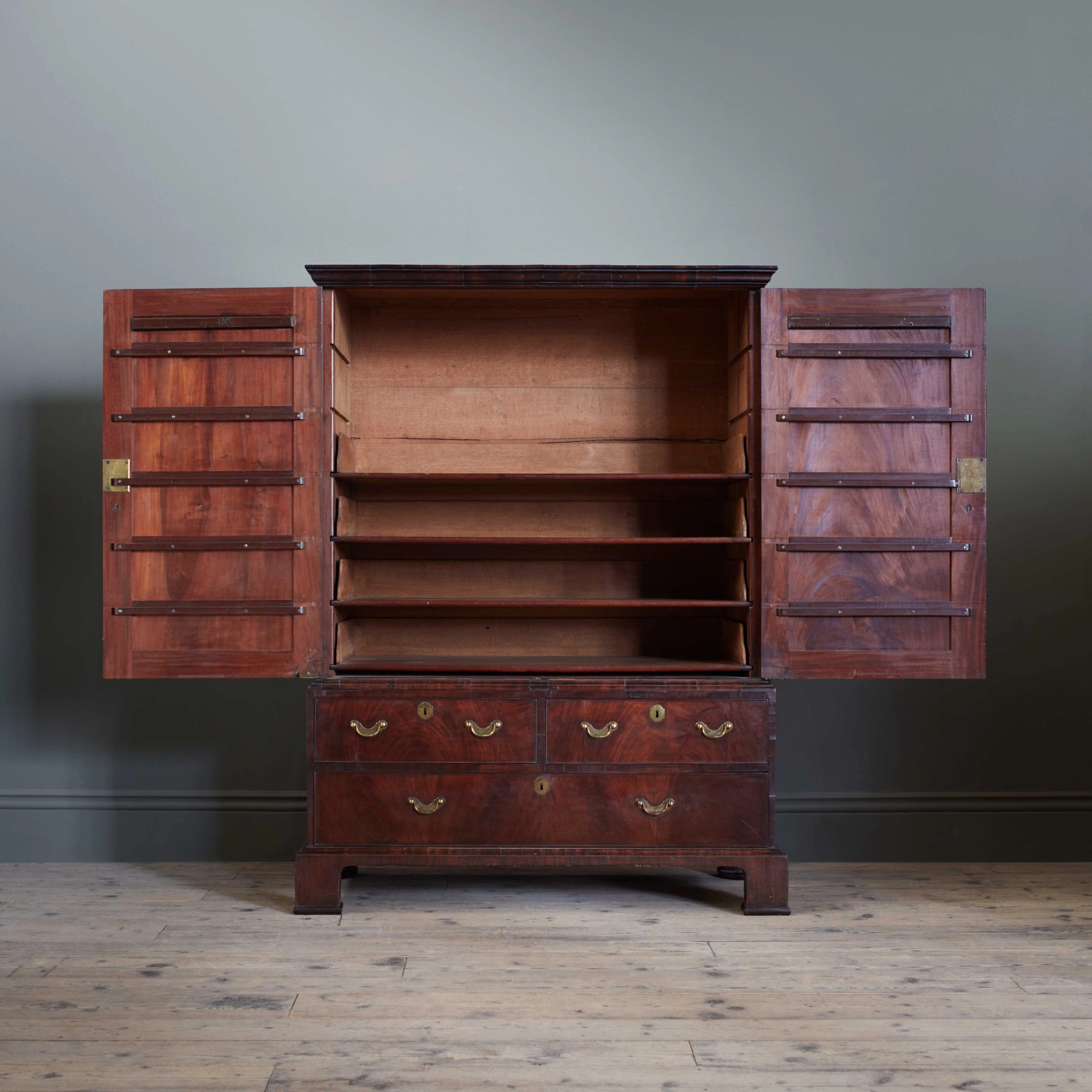 The mahogany surface with a depth of timber patination, and exceptional surface; the panelled doors enclosing sliding drawers which can be extended and rested on the ‘door runners’, above two short and one long drawer. With colossal scale original metalwork, and brass carrying handles to the flanking sides.