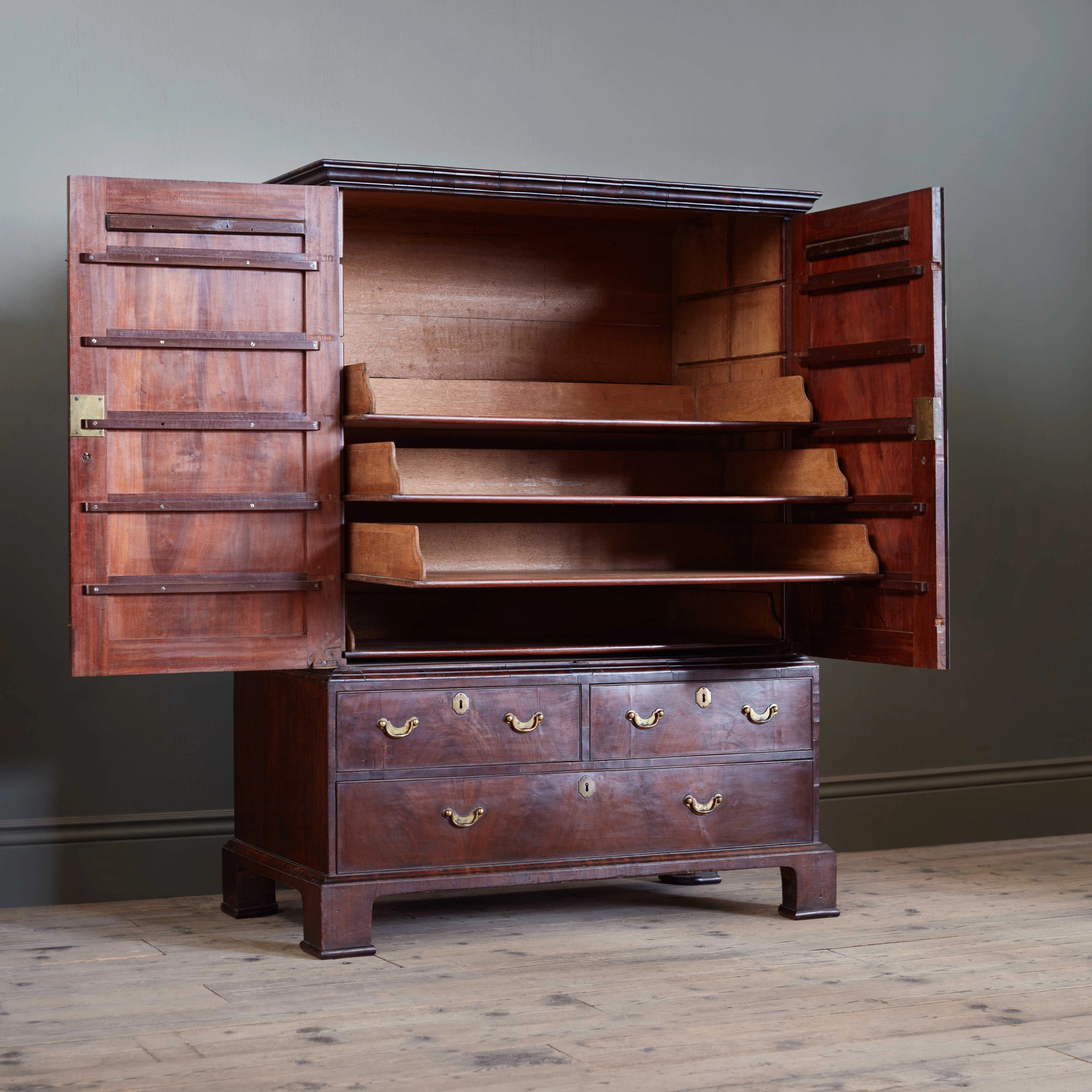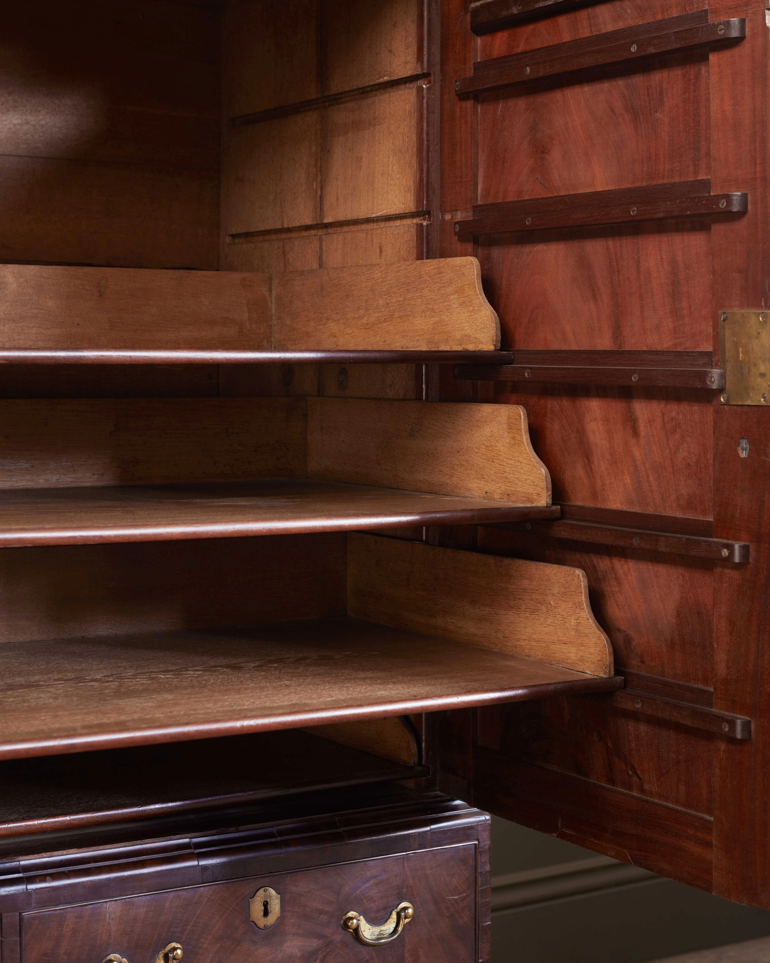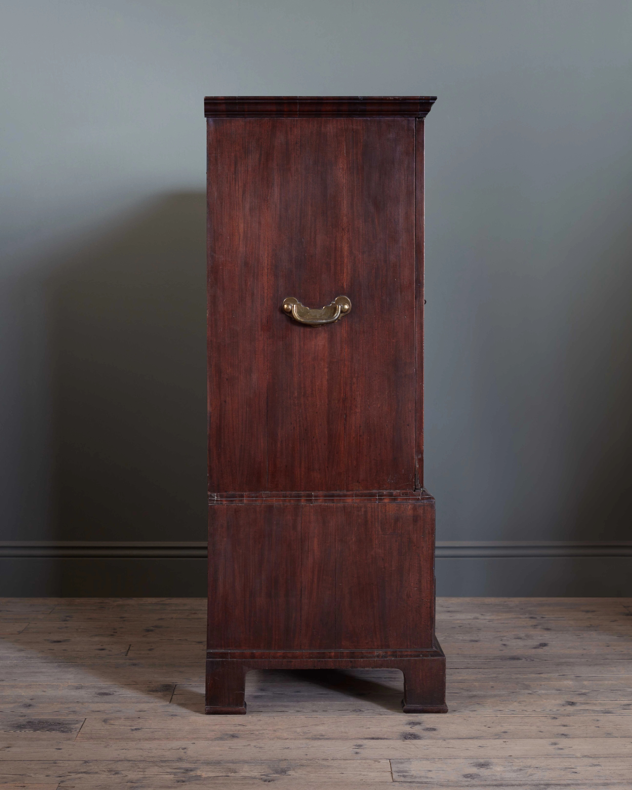 The mahogany surface with a depth of timber patination, and exceptional surface; the panelled doors enclosing sliding drawers which can be extended and rested on the ‘door runners’, above two short and one long drawer. With colossal scale original metalwork, and brass carrying handles to the flanking sides.