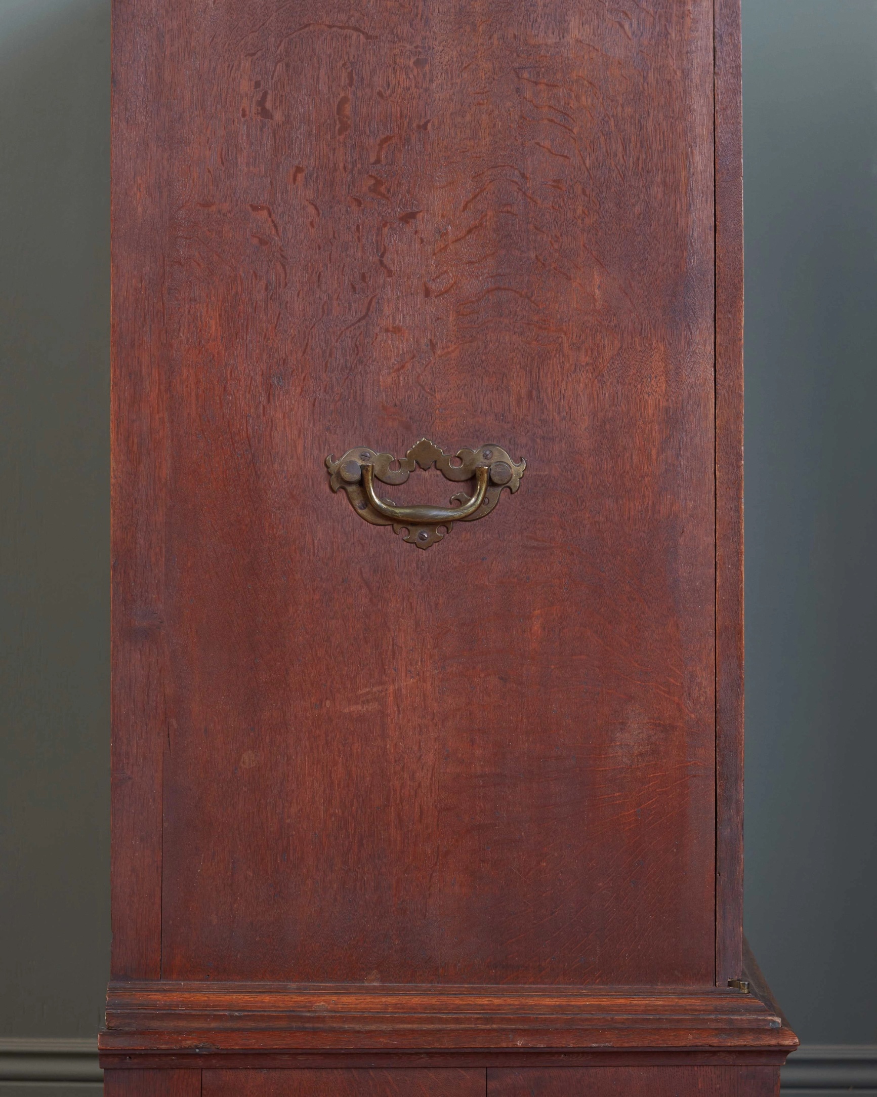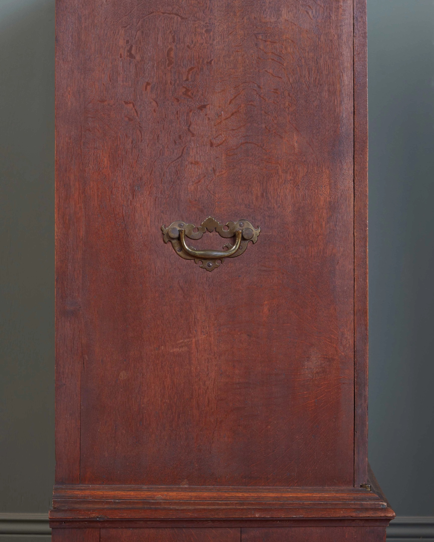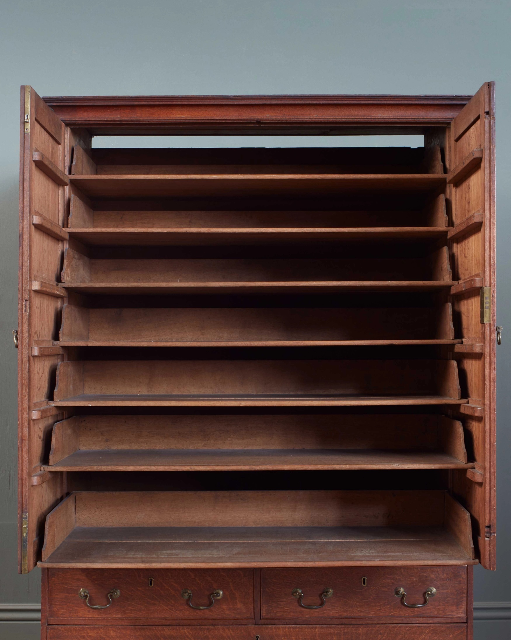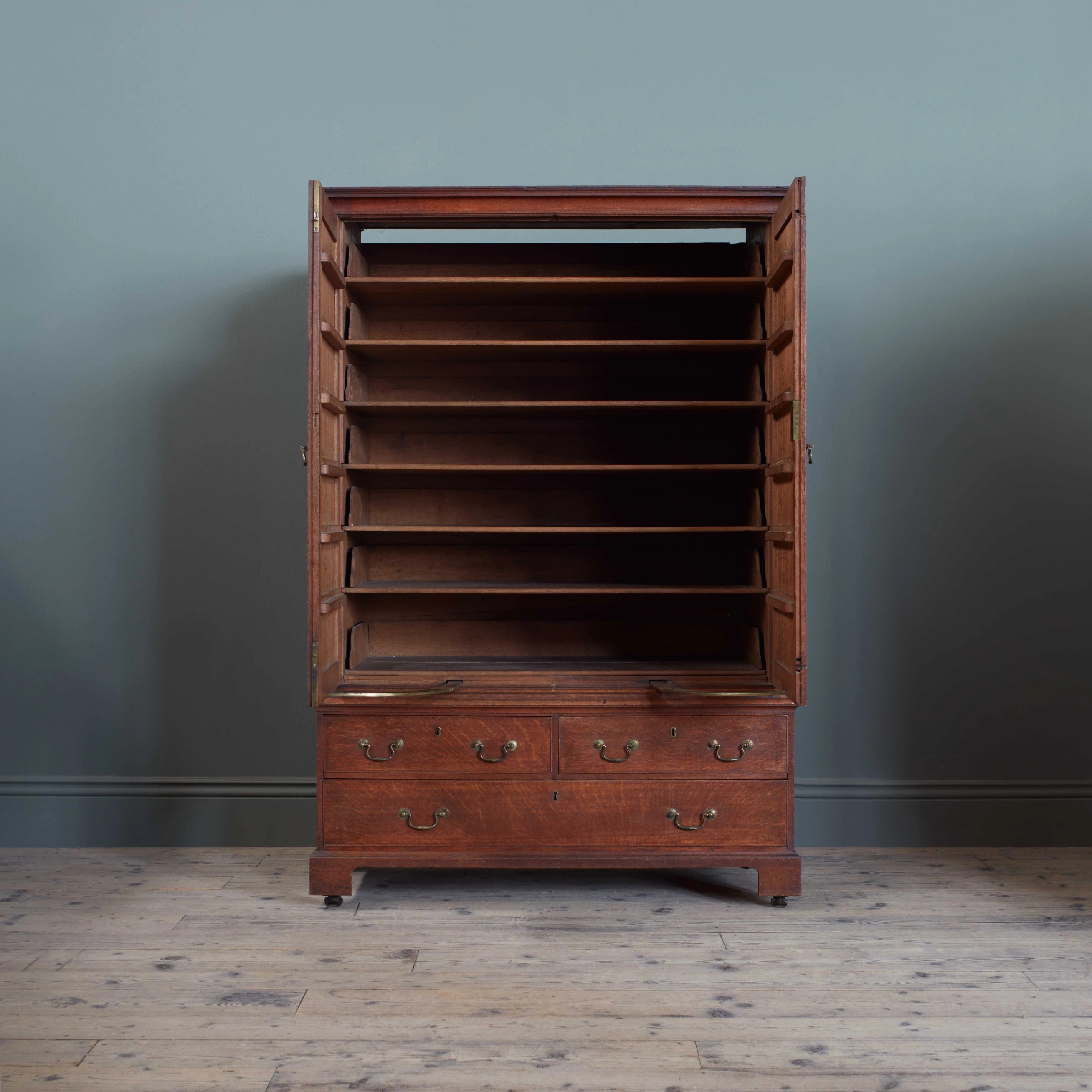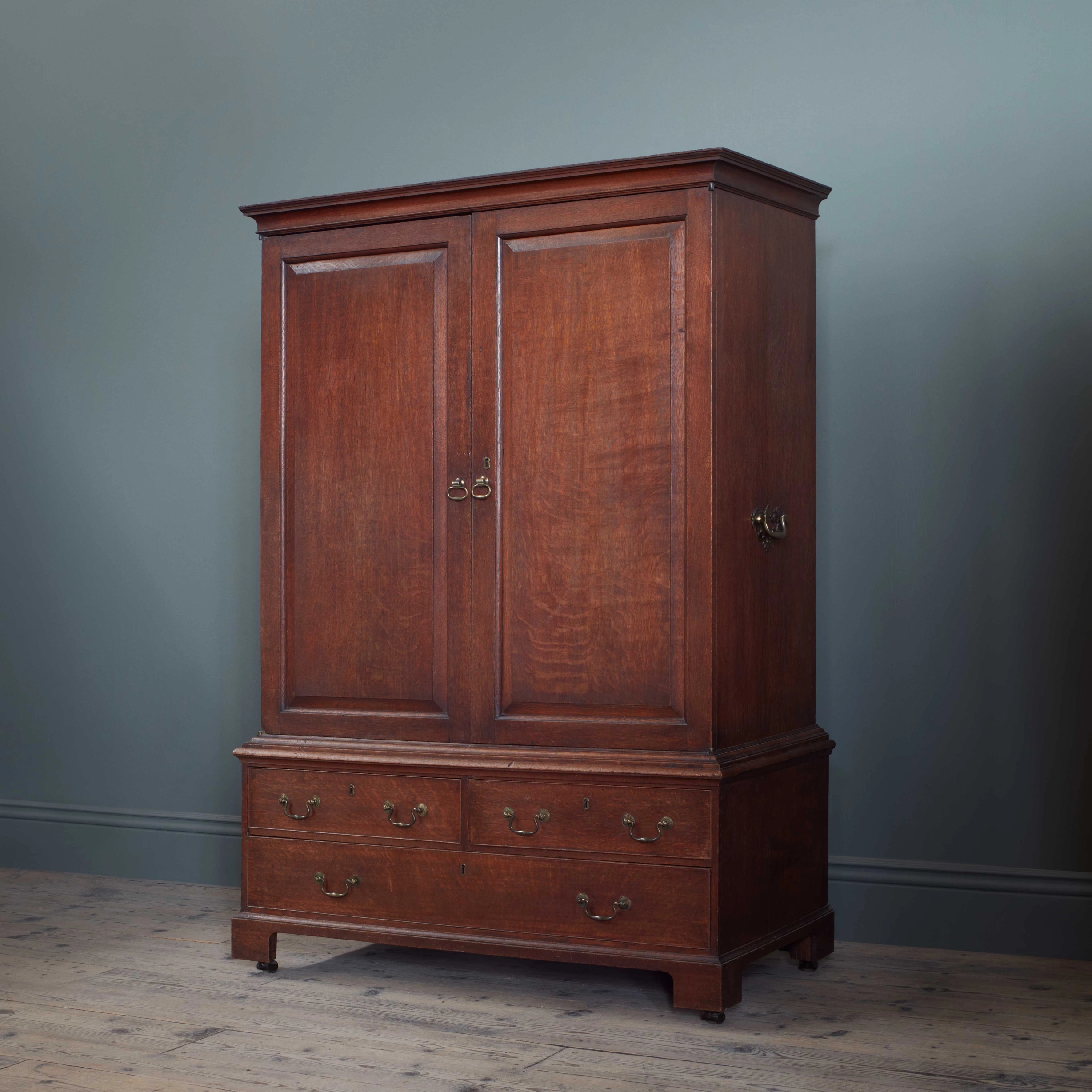 Of weighty proportions, handsome in form, with a sleepy untouched deep patination to the oak. The two hinged doors open to reveal a series of linen press drawers, which can be extended and rested on the ‘door runners’, to extend the depth of reach. The bottom section with three long drawers, on weighty brass casters, with swan neck handles and large brass carrying handles to the sides. A quiet and strong staple piece of grand country house furniture, in the humble form.