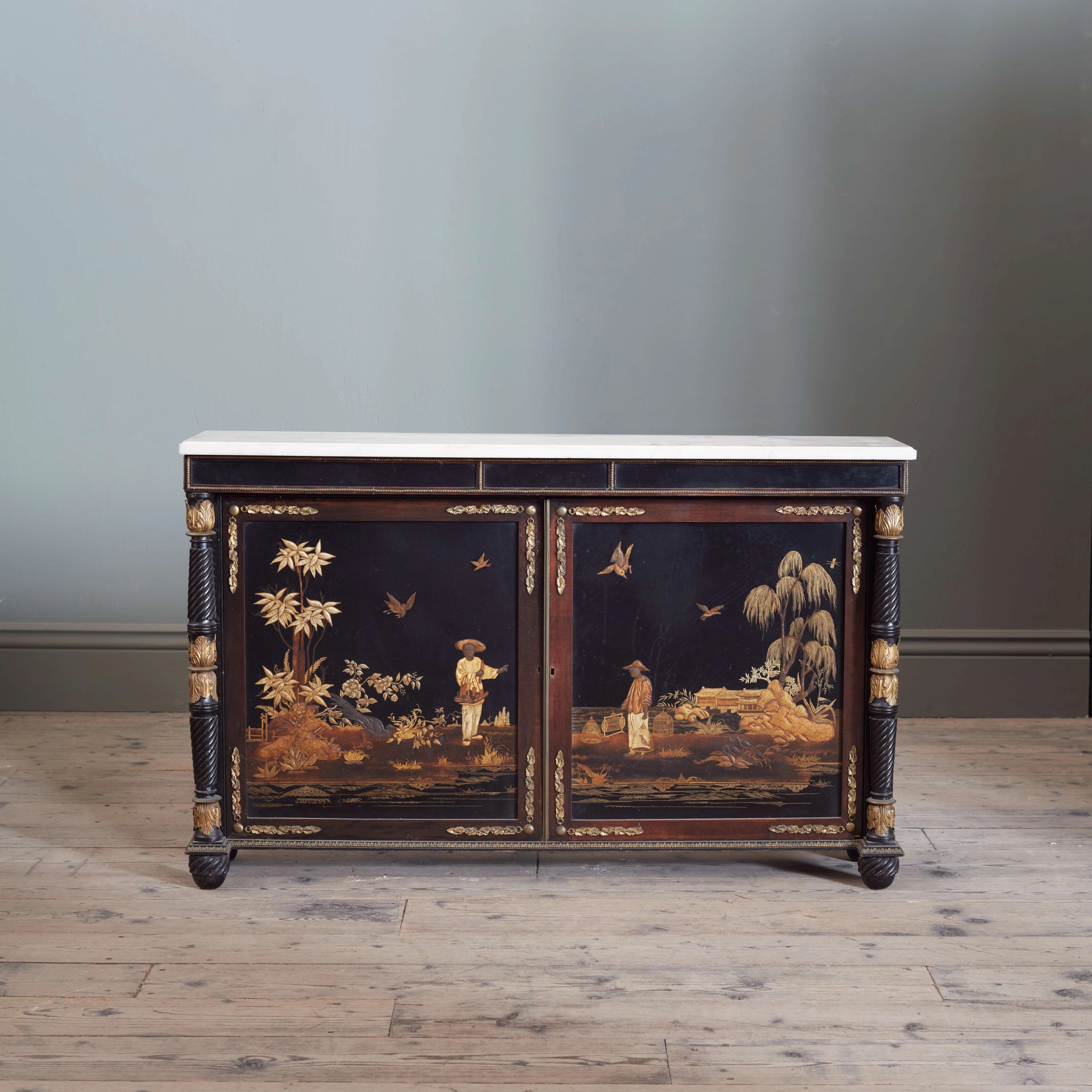 With white marble top and ormolu mounts, above two papier maché doors decorated with simulated Japanese lacquer panels, enclosing an adjustable shelf, flanked by spiral & reeded columns and bun feet, stamped ‘CLAY LONDON’ to the reverse of each door (Henry Clay, c.1825)