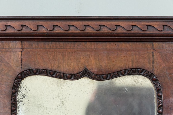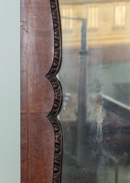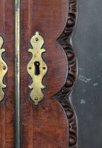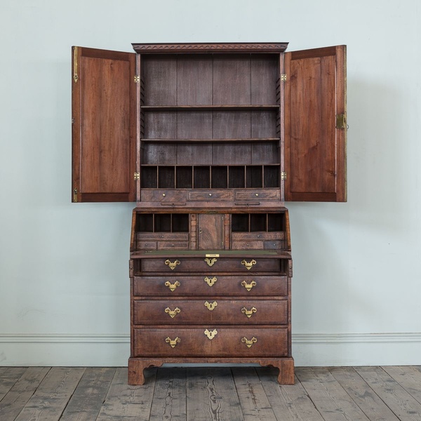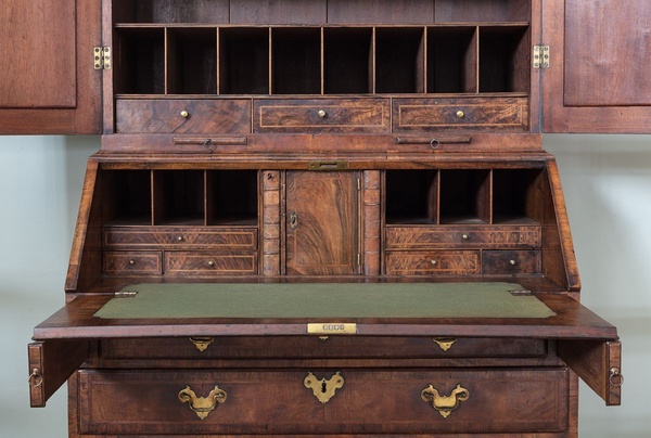 The scroll cornice above a pair of shaped mirror doors enclosing shelves and pigeon holes, the bass with a rectangular fall enclosing a fitted interior with false book bindings and four long drawers below on bracket feet. English, circa 1740.