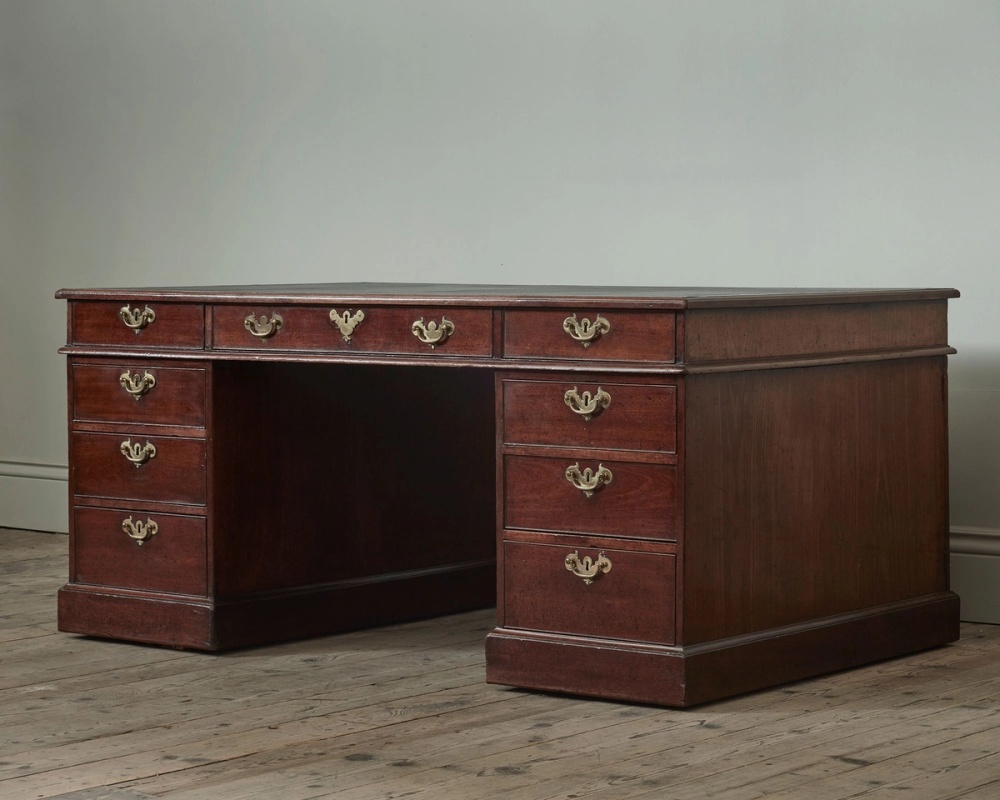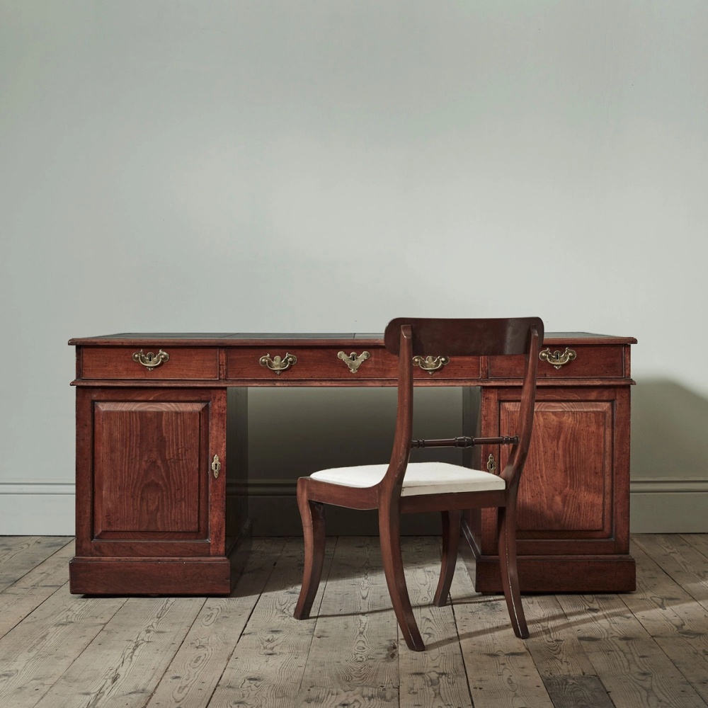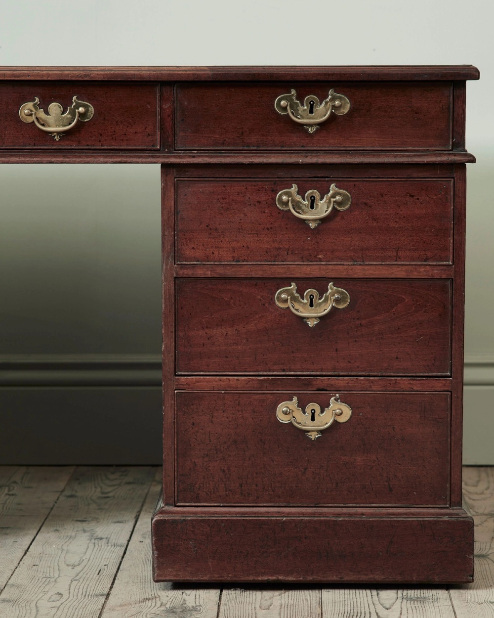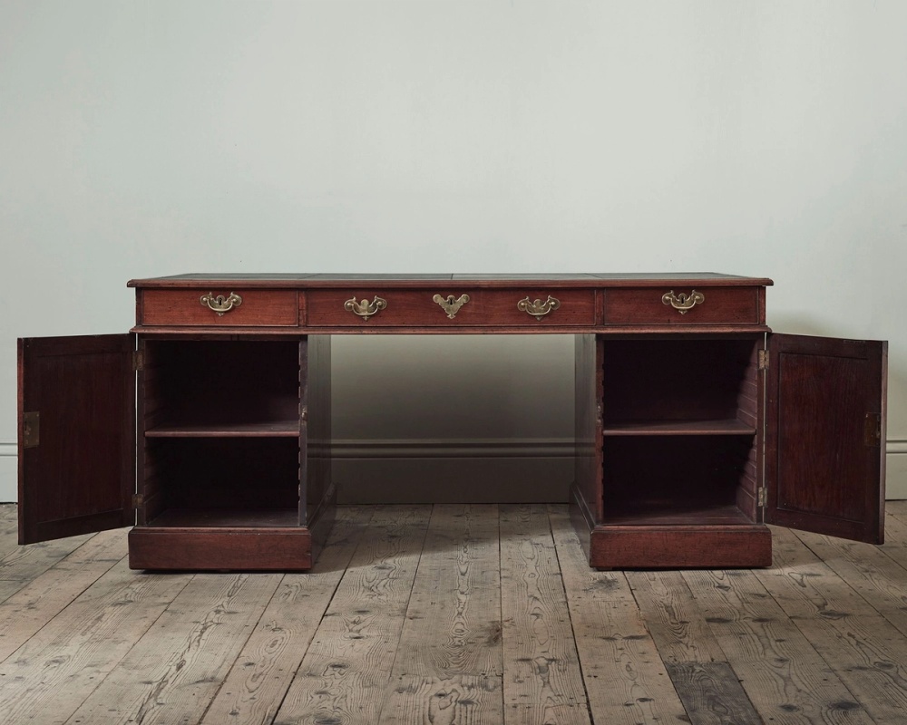 The tooled tan leather inset top above three frieze drawers to each side, one side with three graduated drawers to each pedestal, the opposing side with two cupboard doors enclosing an adjustable shelf, on wooden castors.