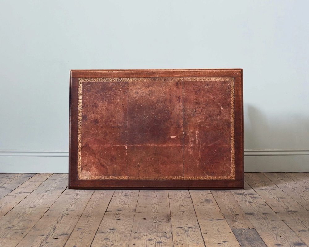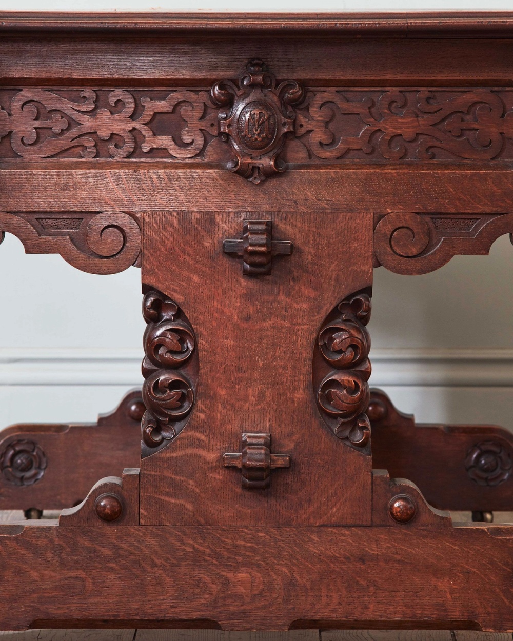 With extensive gothic carving work, the sides with strapwork carving centred by a monogram reading “MP”, the trestle ends joined by two stretchers and raised on brass castors. With a beautifully worn brown tooled leather top, above a frieze with two drawers and castle handles and escutcheons. English c.1850.