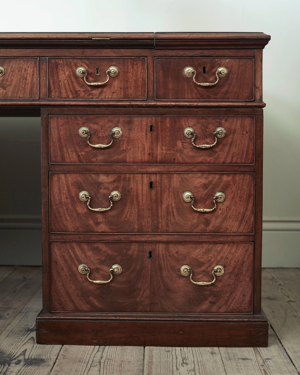 With ratchetted rectangular Moroccan red leather top above eleven drawers surrounding a central kneehole, the reverse with five frieze drawers above a pair of panelled cupboards, the whole on moulded plinth bases. The highly figured book matched veneers to the drawer fronts, together with the unusual and distinctive handle configuration, combine to make this desk a truly magnificent example of its type.